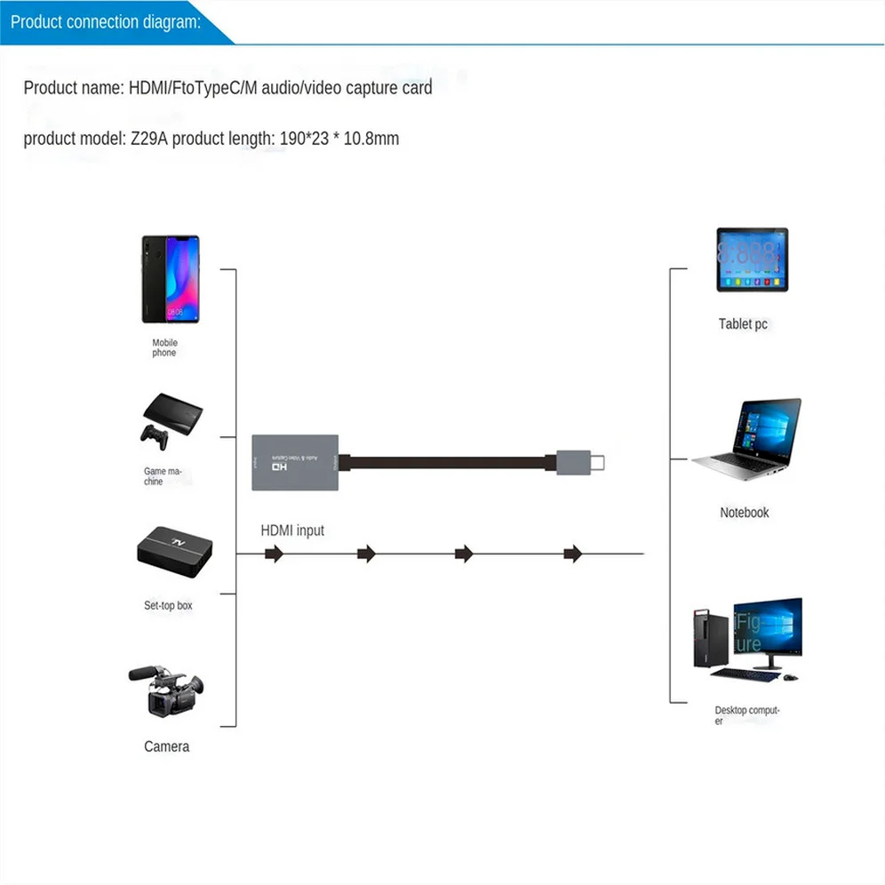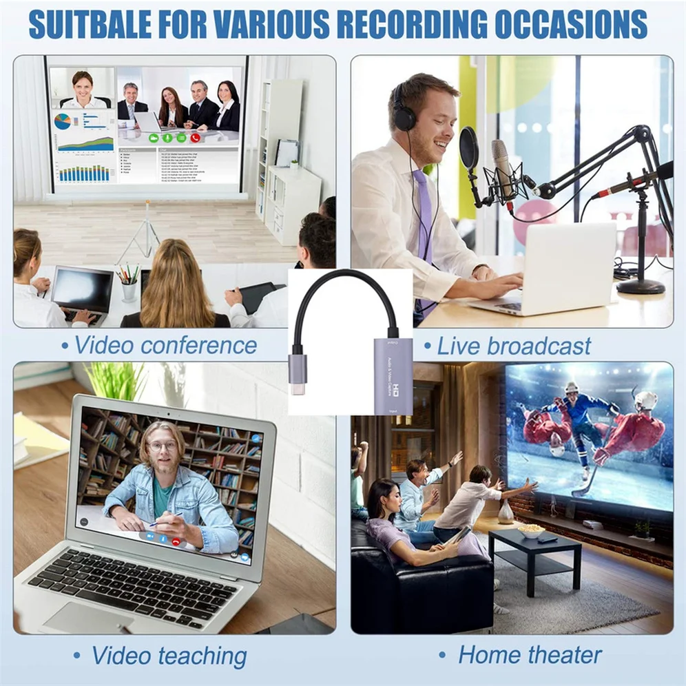 Descripción: Material: Protección Ambiental de alta gama, oxidación de la superficie de la arena; Tiene una buena capacidad antiinterferencia y de disipación de calor. Funciones: una tarjeta de grabación de vídeo HD portátil puede capturar simultáneamente señales de sonido y vídeo Desde HDMI y transmítelos a teléfonos móviles y ordenadores para una vista previa, Edición, almacenamiento y otras aplicaciones multifunción. Aplicación: la interfaz HDMI está conectada a señales de entrada de audio y vídeo, Y la interfaz de la USB-C está conectada a teléfonos móviles u ordenadores para obtener una colección HD. Grabación de video, transmisión de video, grabación educativa, transmisión de juegos en vivo, Transmisión de vídeo, grabación de vídeo HD con cámara, etc.