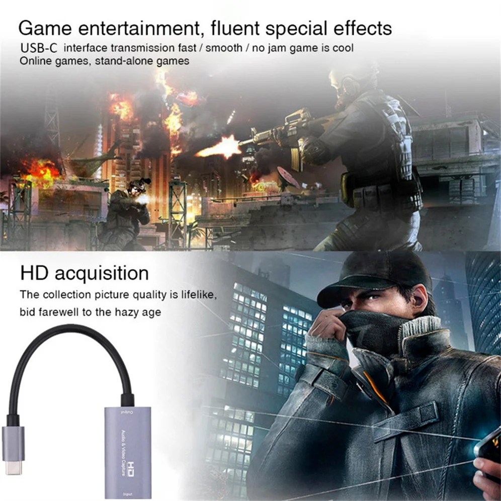 Especificación: Cumple con las especificaciones de vídeo/audio USB UVC; Sistema operativo: compatible con Windows, Android y MacOS; Admite la mayoría de software de adquisición: Como VLC, OBS, Amcap, etc. Colección HD: fuerte compatibilidad, imagen suave sin retraso, sin retraso Plug and Play: no se requiere alimentación externa, por lo que es compacto y fácil de transportar. Entrada de alta definición 4K a 30HZ: admite entrada de alta definición 4K, grabación de vídeo 1920X1080P y transmisión en vivo, Restaure la textura, tonos, sombras, iluminación y otros detalles en el juego, lo que le permite lucir espléndido y maravilloso. Colores más brillantes y calidad de imagen más clara. Captura de alta definición, gran compatibilidad, imagen suave sin tartamudeo, sin retraso. Tipo: Tarjeta de captura de vídeo HDMI: admite una resolución de entrada máxima de hasta 4K; Tipo C: admite una resolución de salida máxima de hasta 1080P; Paquete incluido: