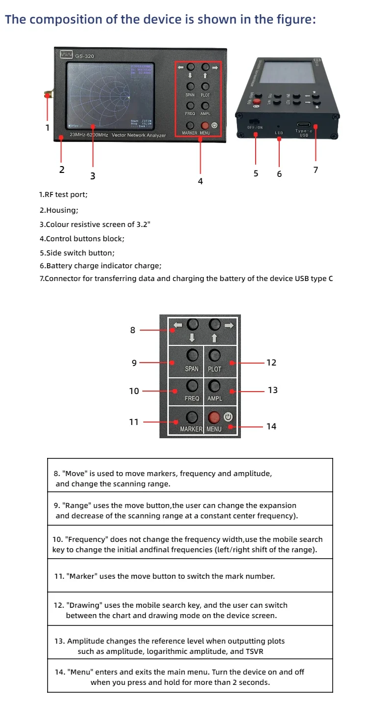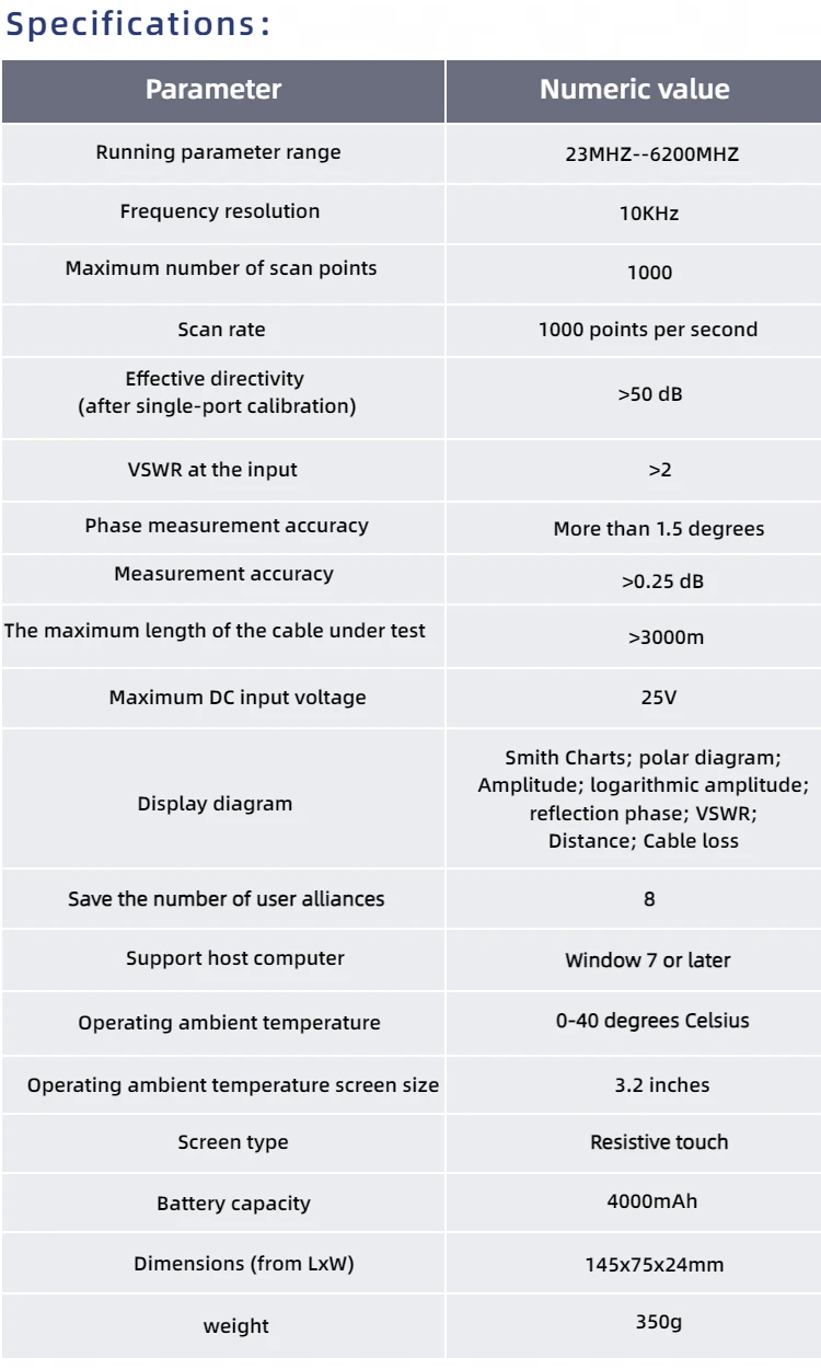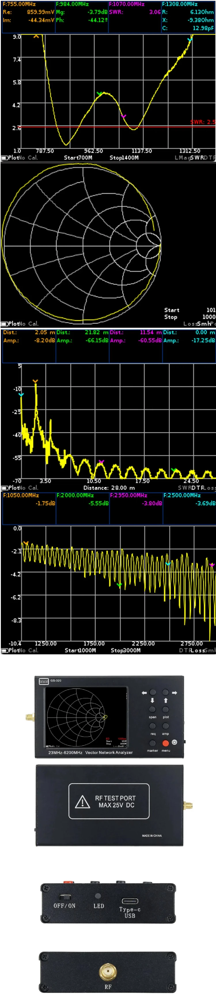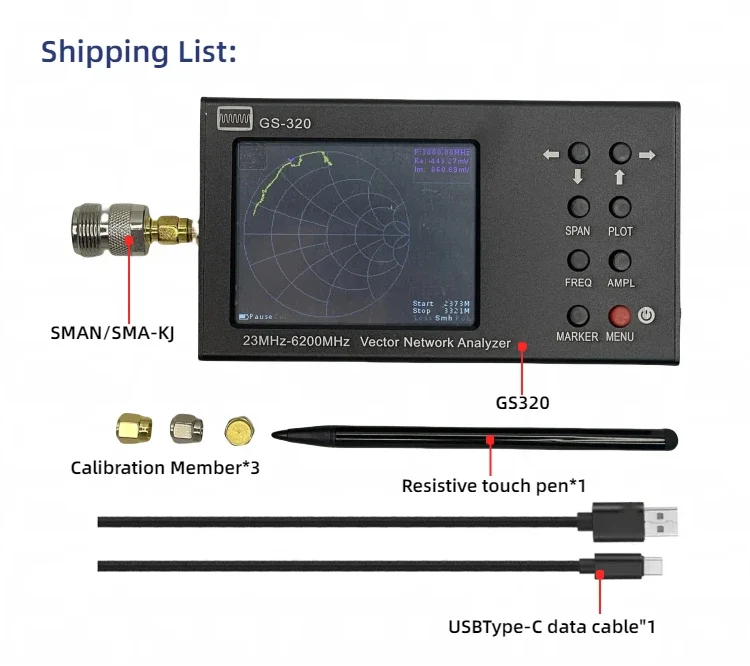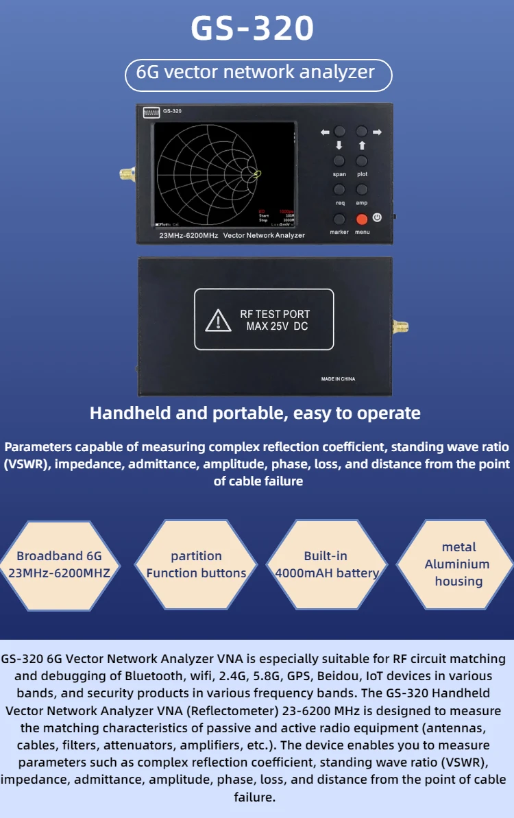 Analizador de red vectorial HTOOL GS320 de 6 GHz para medición de la relación de onda estacionaria de antena (VSWR) y análisis de red RF.