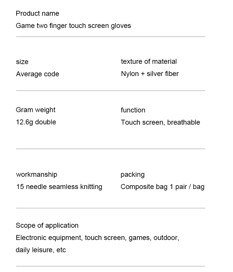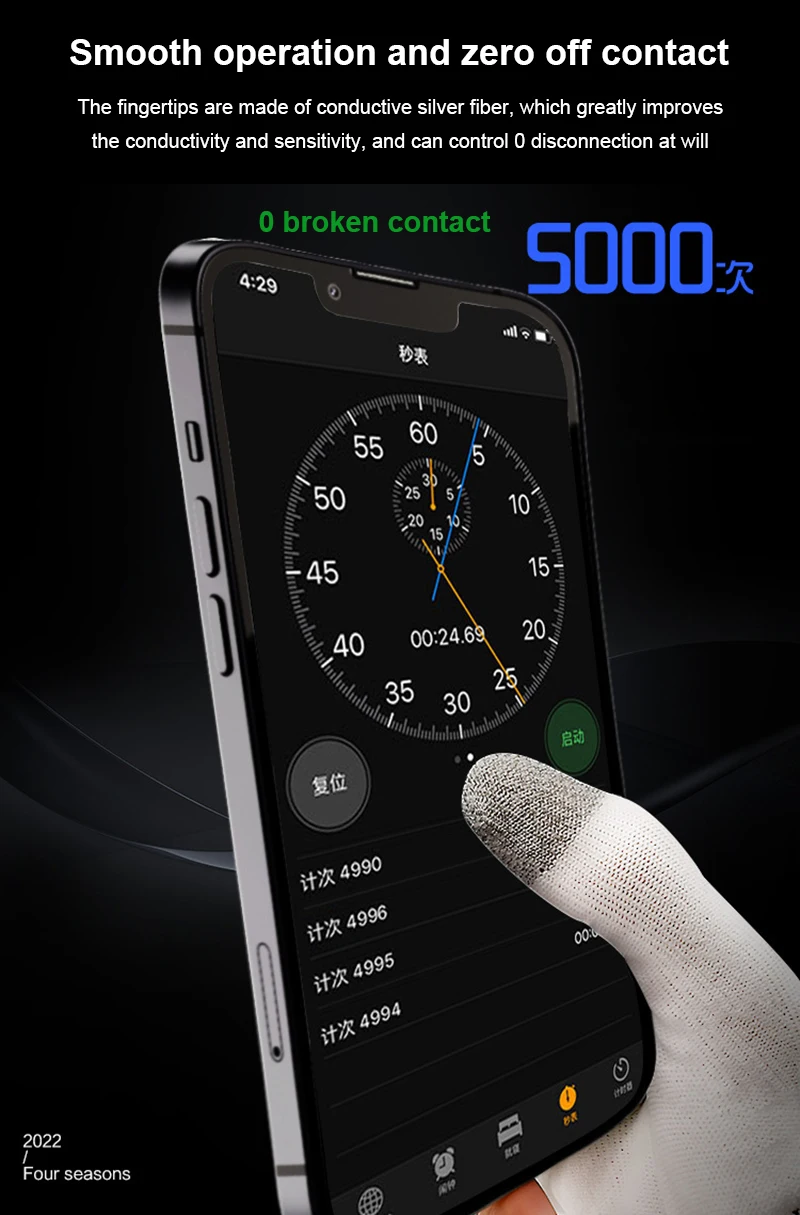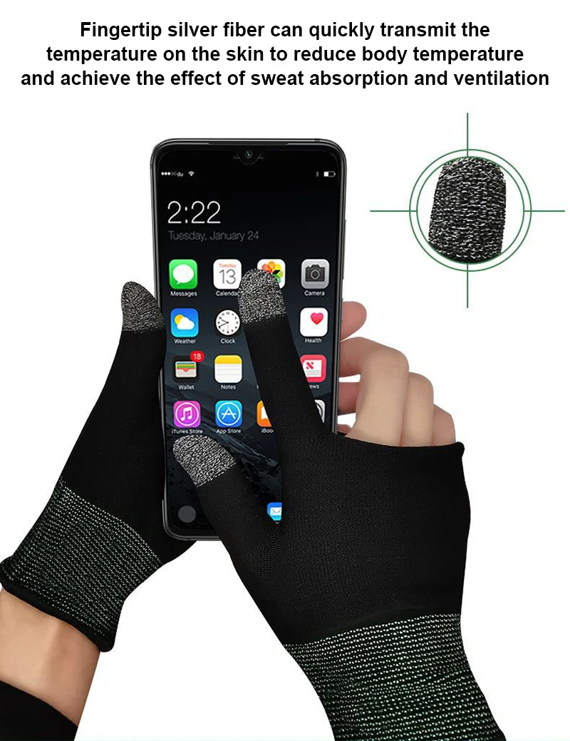 Utiliza fibra plateada de escala superior en la parte del dedo, que es superconductora, altamente sensible y tiene una experiencia de deportes electrónicos en la punta del dedo.