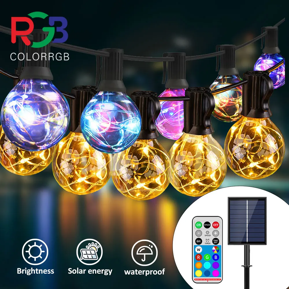 Comprar Guirnalda de luces solares para exteriores, luces de doble potencia G40 para patio trasero, pérgola, fiesta, Bistro, colores RGB