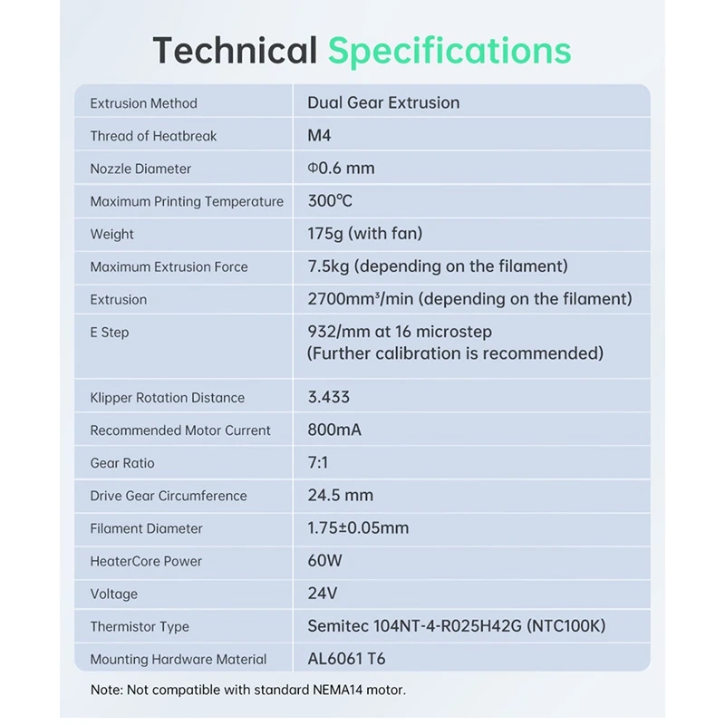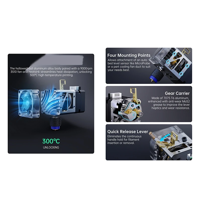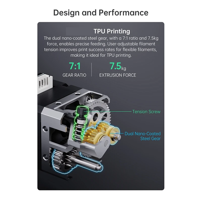 El engranaje de acero de doble nano recubrimiento, con una relación de 7:1 y una fuerza de 7,5 kg, permite una alimentación precisa. La Tensión de filamento ajustable por el usuario mejora las tasas de éxito de impresión de filamentos flexibles, lo que lo hace perfecto para la impresión de TPU. Amplia compatibilidad. Adecuado para Hurakan, BIQU BX, BIQU B1, Voron2.4, Voron V0, Vzbot, etc.
