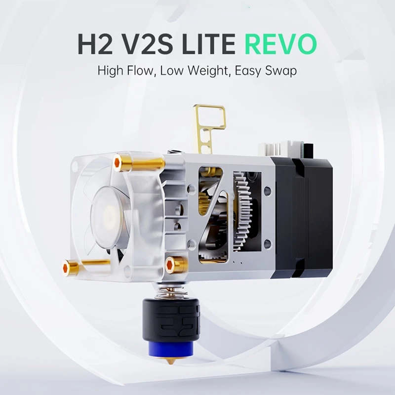 ¿Por qué H2 V2S LITE para Revo? Tasa de flujo más alta de 45mm: Para Revo™Alto flujo Hotside. Intercambios de boquilla fáciles para Revo™: Para Revo™La boquilla permite cambiar la boquilla a mano sin herramientas. 175g notablemente ligero: peso más ligero, mayor precisión. Impresión superior de TPU: el tensor de tornillo, ajustable para filamentos flexibles, mejora el agarre y optimiza la impresión de TPU