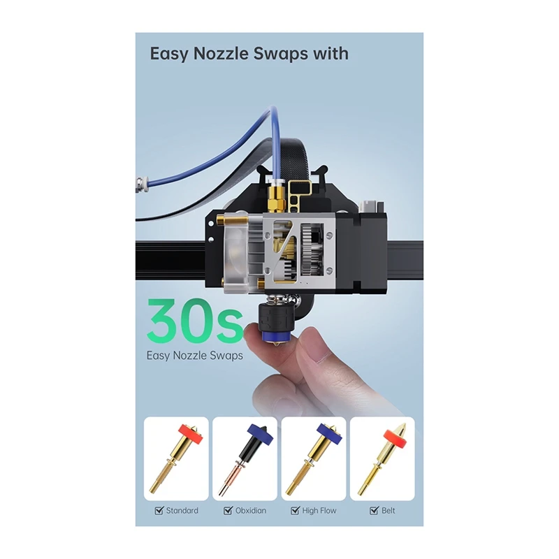 NOTA: La Impresión de alto flujo requiere un Ventilador de alto rendimiento para que el enfriamiento activo disipe el calor de manera efectiva. Intercambios de boquilla fáciles para Revo™... Todos para Revo™La boquilla se puede cambiar a mano a temperatura ambiente. No más herramientas, no más apriete en caliente. Notablemente ligero pero sólido