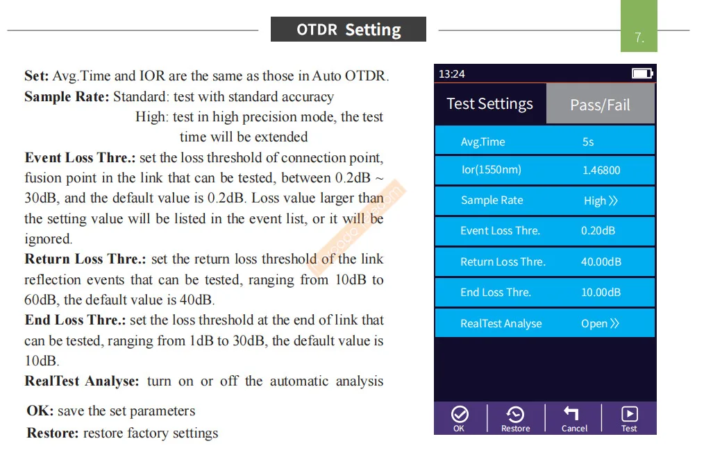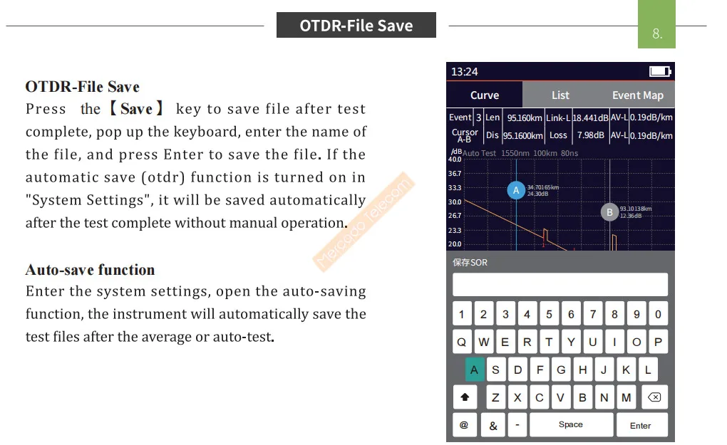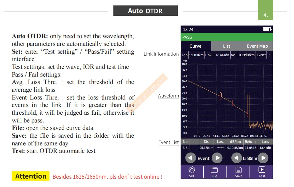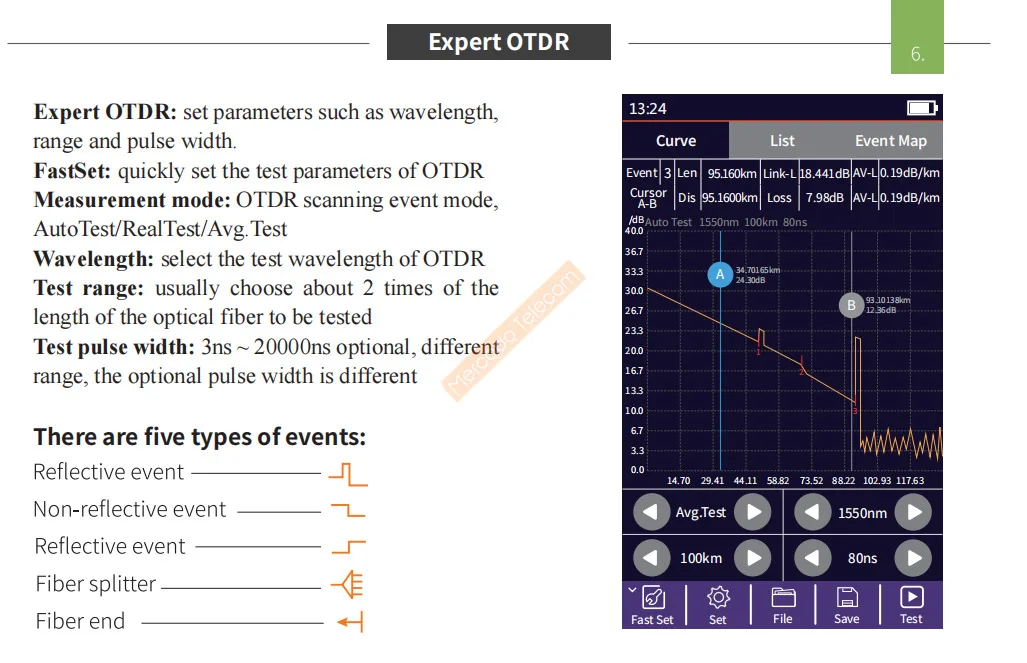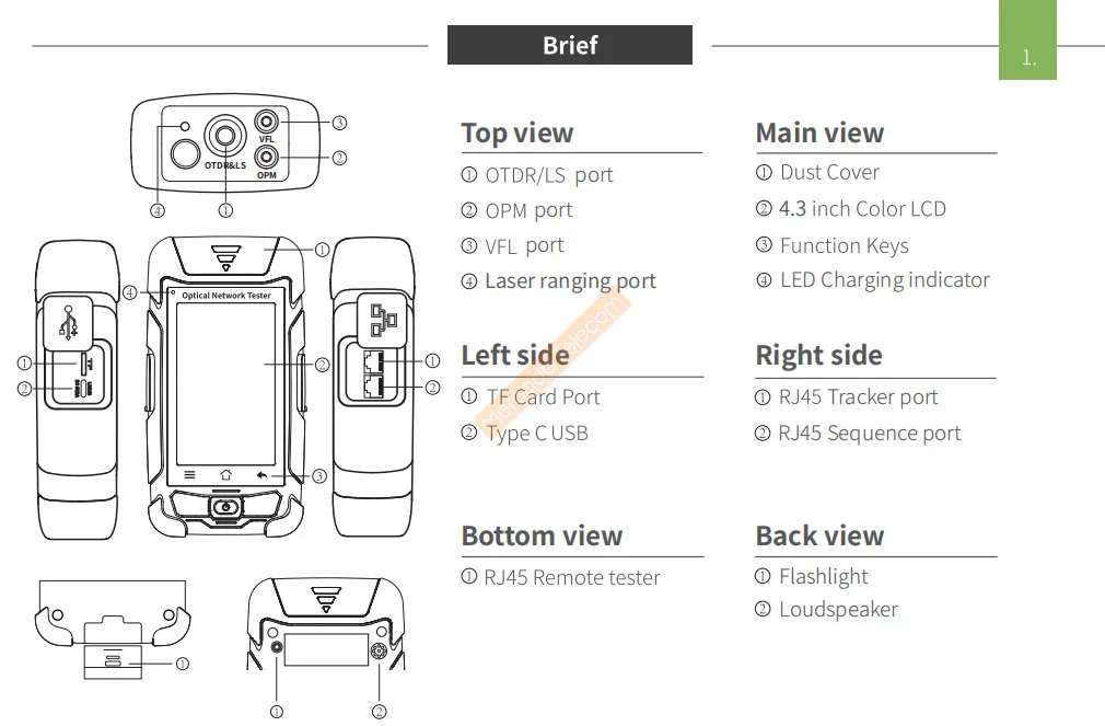 Puede cumplir con varios requisitos de prueba en diferentes ocasiones. OTDR tiene 1m de área ciega de evento ultracorto, el rango dinámico máximo es 32dB, 8G de almacenamiento que puede almacenar 200000 curvas; utiliza una batería de polímero de litio de alta densidad y alta capacidad de 4000mAh, y el tiempo de funcionamiento es de más de 10 horas con alto brillo. Tiene una precisión de prueba precisa y capacidad de recopilación de información, y el potente software de análisis interno puede proporcionar un servicio de datos preciso para los probadores de terminales.