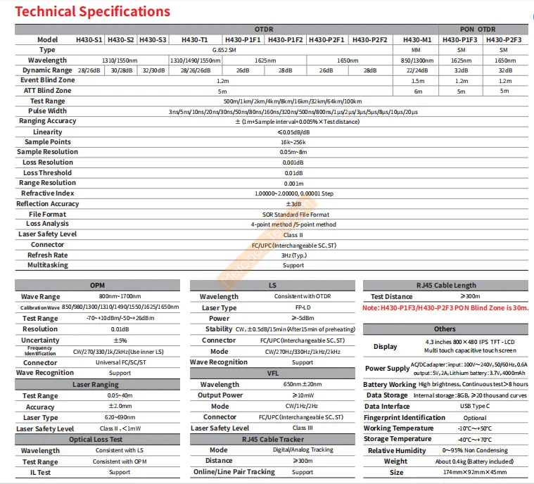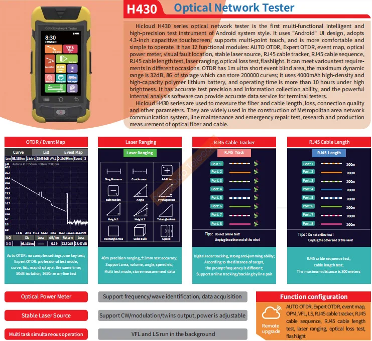 Probador de red óptica H430, SM MM Pro OTDR 1310/1550nm 850/1300nm 1625/1650nm Reflectómetro óptico 4,3 'Touch OLS OPM VFL Event Map RJ45 Cable Tester H430