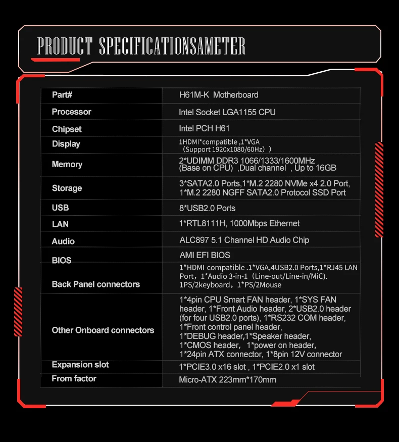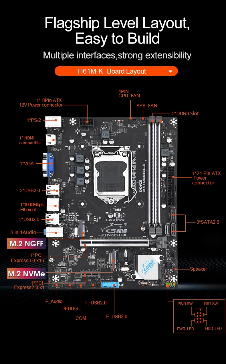 Comprar H61M-K-placa base de escritorio LGA 1155, CPU para NVME NGFF M.2 2280, SSD, VGA, HDMI, compatible con 2 x DDR3, Memoria RJ45, USB 2,0, SATA 2,0, 16GB