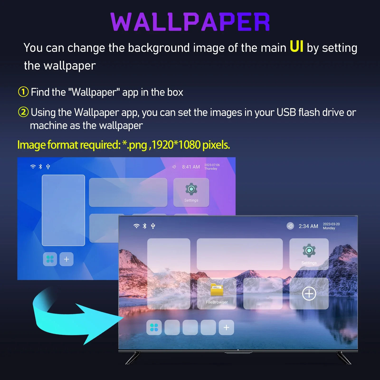 2 Usando la aplicación Wallpaper, puede configurar las imágenes en su unidad flash USB o máquina como fondo de pantalla.
