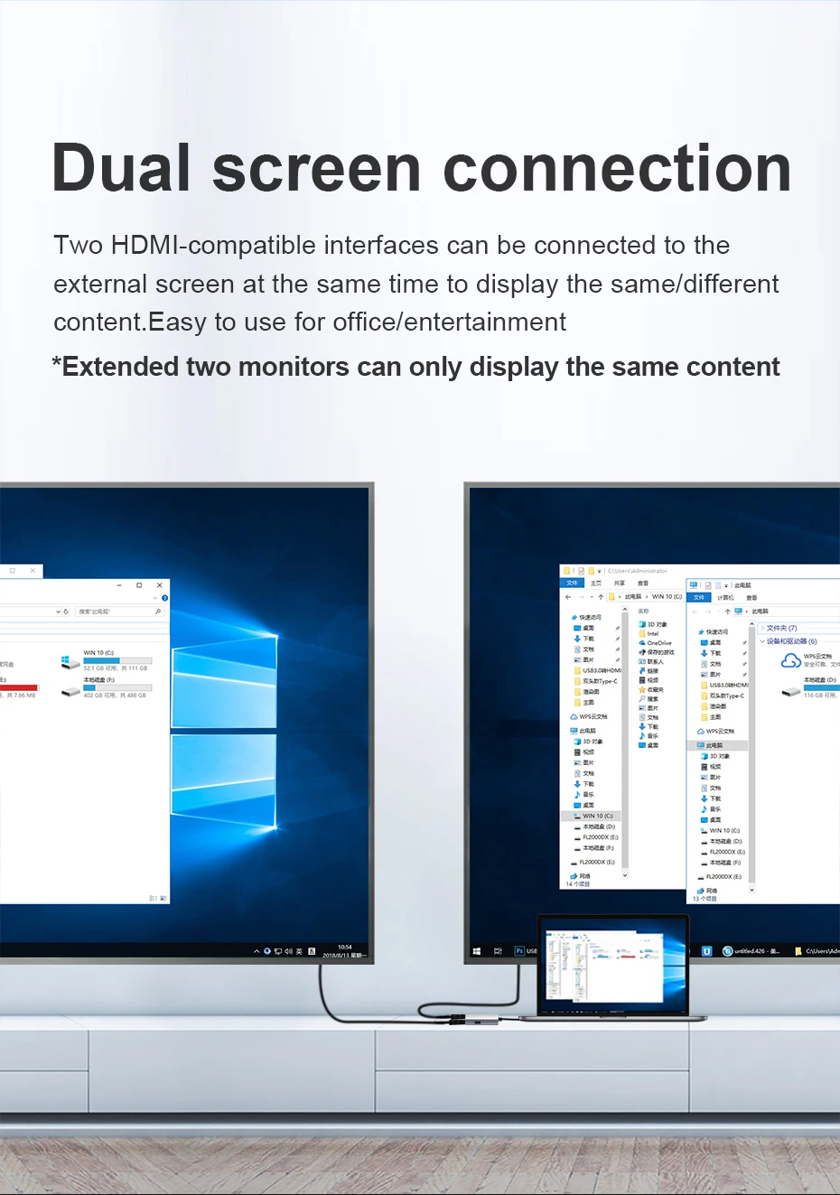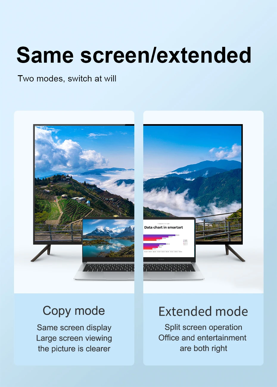 【Copiar/extender dos modos】La pantalla convertida puede admitir dos modos de expansión y copia, ¡puede elegir libremente!Cuando se utilizan ambos puertos HDMI al mismo tiempo, los dos monitores adicionales solo pueden mostrar el mismo contenido
