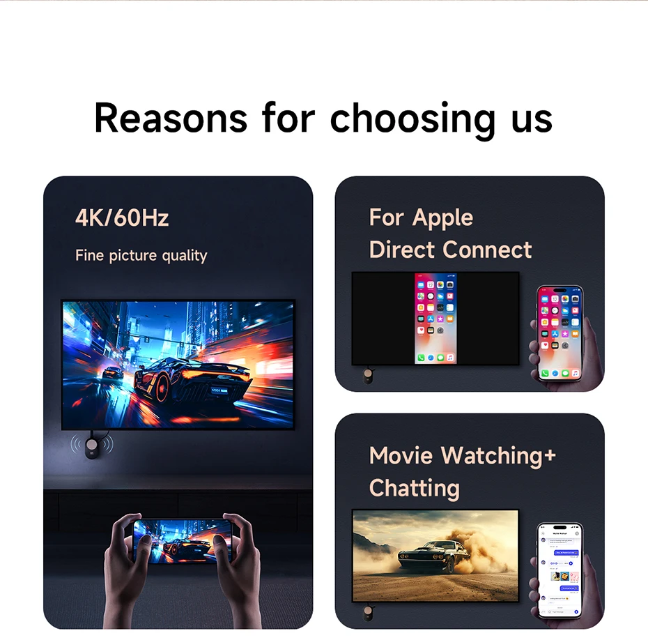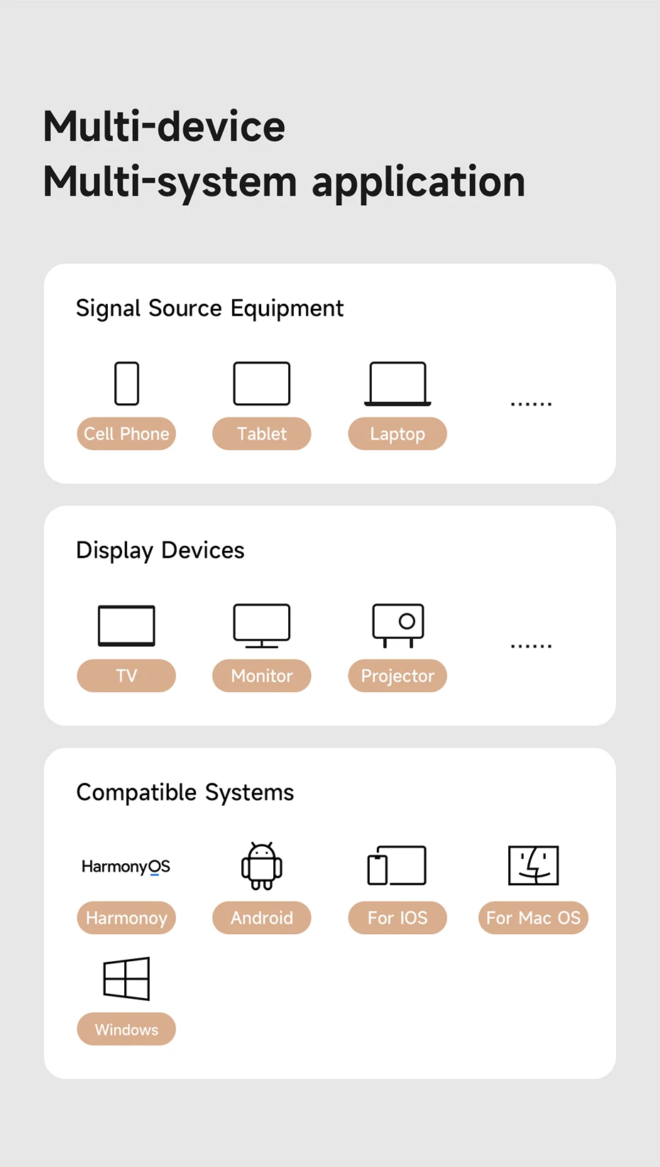 Nota: Debido a la limitación del sistema del dispositivo en sí, el ordenador Windows puede admitir hasta 4K/30Hz, para el ordenador Apple solo admite hasta 1080P/60Hz; para HarmonyOS, los teléfonos móviles Android y Apple pueden soportar hasta 1080P/60Hz en modo espejo y 4K/60Hz en modo push.