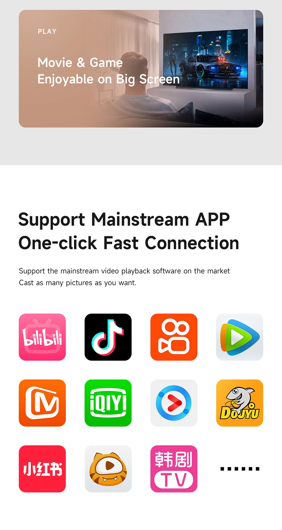 Espejo de pantalla:Transmite y duplica la transmisión de YouTube desde dispositivos Android e iOS, le permite ver audio o video desde una pantalla pequeña (teléfono inteligente/computadora portátil/iPad) A un dispositivo de pantalla grande (TV/monitor/proyector). Sin usar cables largos y desordenados, puede disfrutar de películas HD en la sala de estar