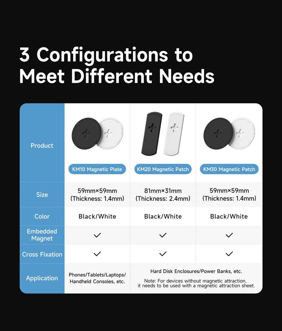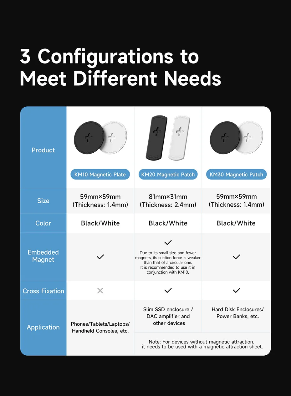 Nota: La opción KM10 Negro/Blanco en selección de colores incluye solo la placa magnética independiente y requiere emparejamiento con un dispositivo que admita la conexión magnética. Si necesita kits magnéticos, seleccione una de las otras cuatro opciones. ¡Asegúrese de seleccionar la opción correcta al realizar su pedido!