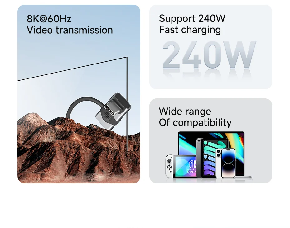 【Diseño multifuncional】 Admite transferencia de datos de hasta 40 Gbps; Admite carga rápida de hasta 240 W mientras es compatible con PD 3.0 y 2.0; Admite transmisión de video de 8K y 60 Hz (requiere compatibilidad con dispositivos para el protocolo de transmisión de video DP)