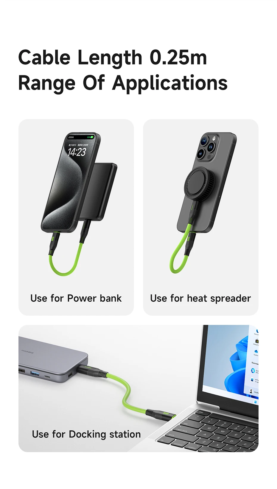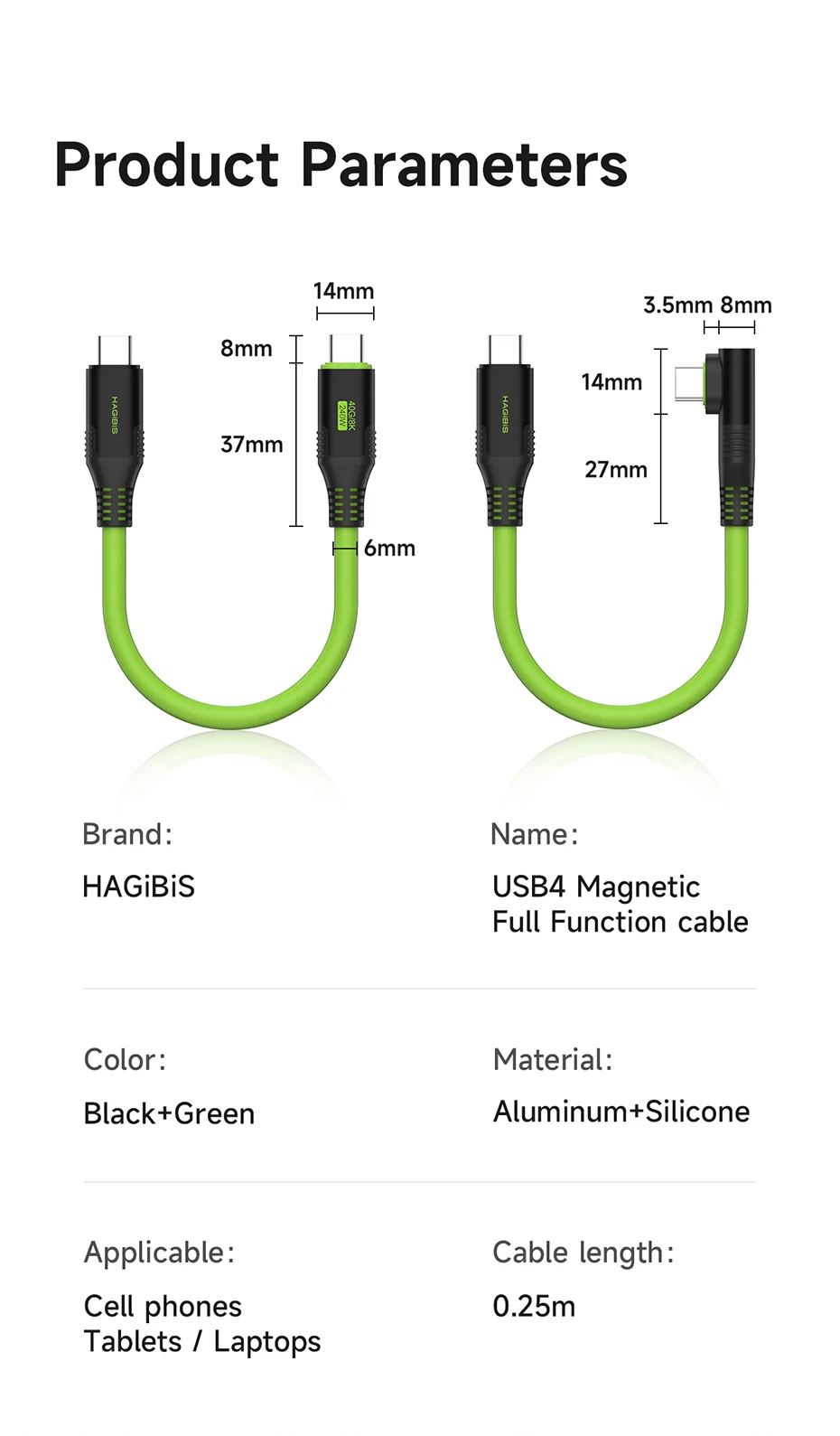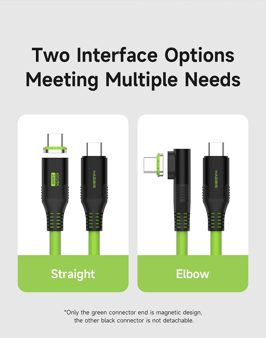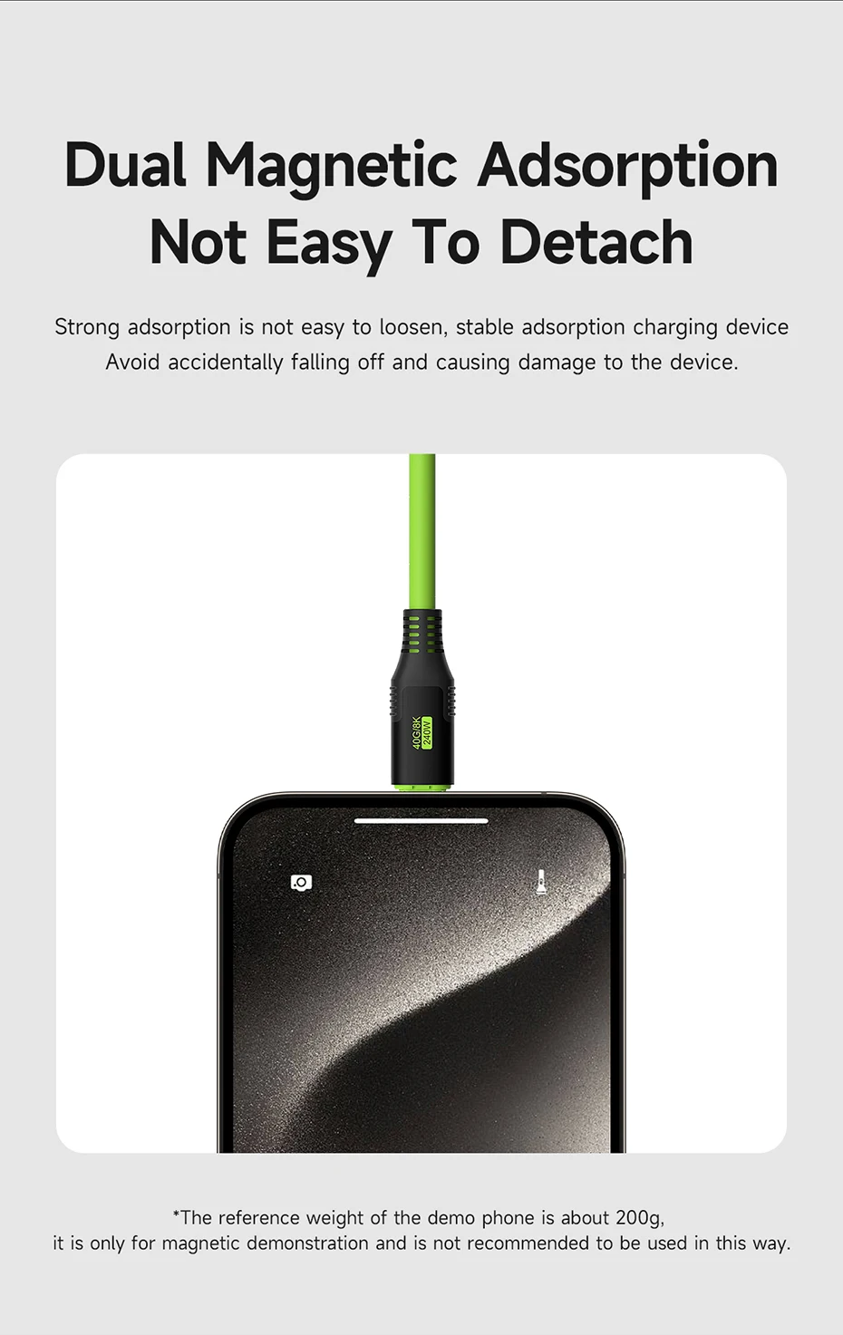 Magnetic plug design:The end of the connecting device is designed as a magnetic plug, effectively avoiding repeated plugging and unplugging, thus protecting and extending the service life of the data cable, but also reduce the loss of the charging port of the device. Note: Only the green port of this product is a magnetic interface, the black port connected to the charger does not have a magnetic function and cannot be detached!