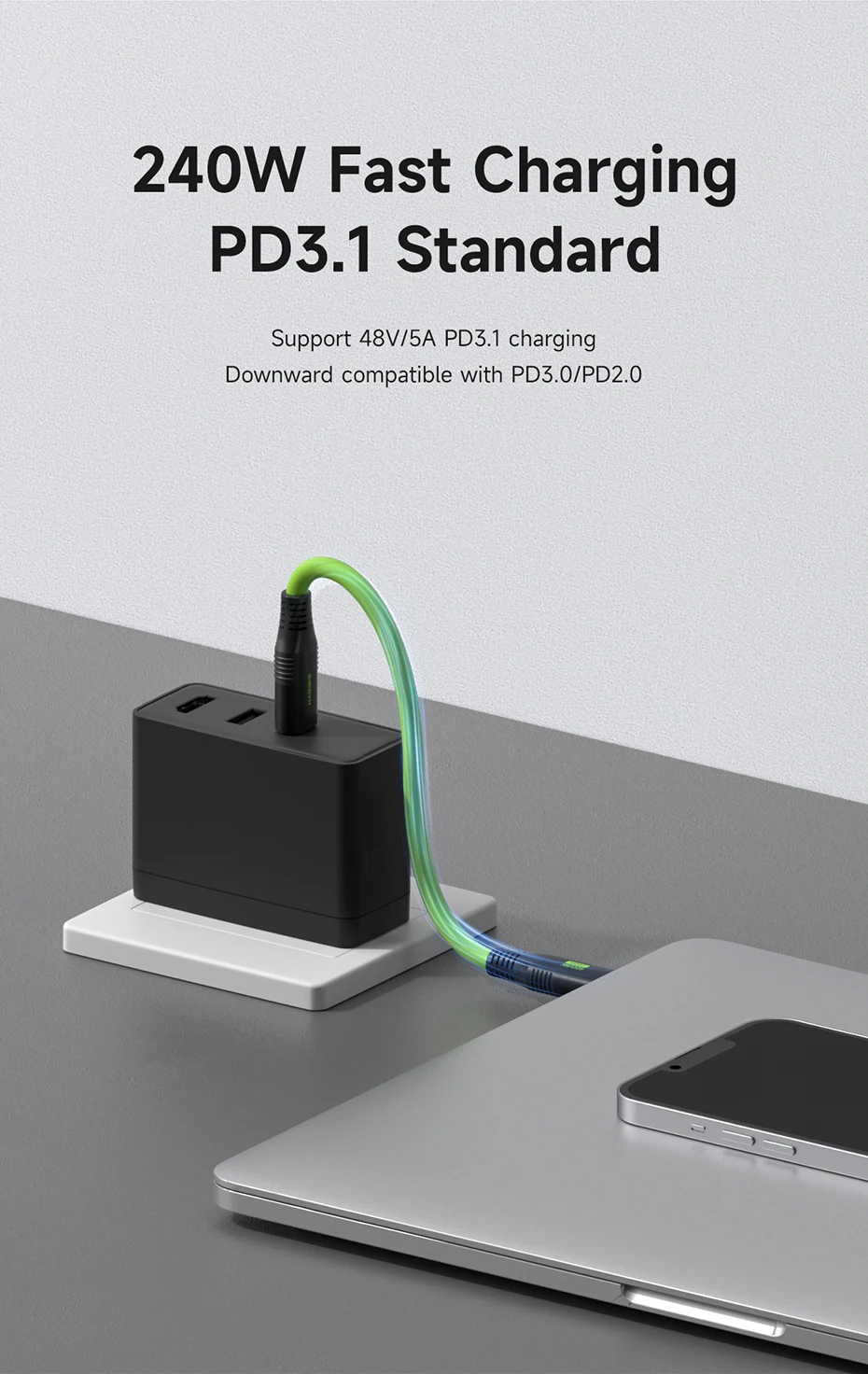 240W Fast Charging:This Cable uses the PD3.1 fast-charging protocol, which supports up to 240W of power transfer, and it's also backward compatible with PD3.0 and 2.0.