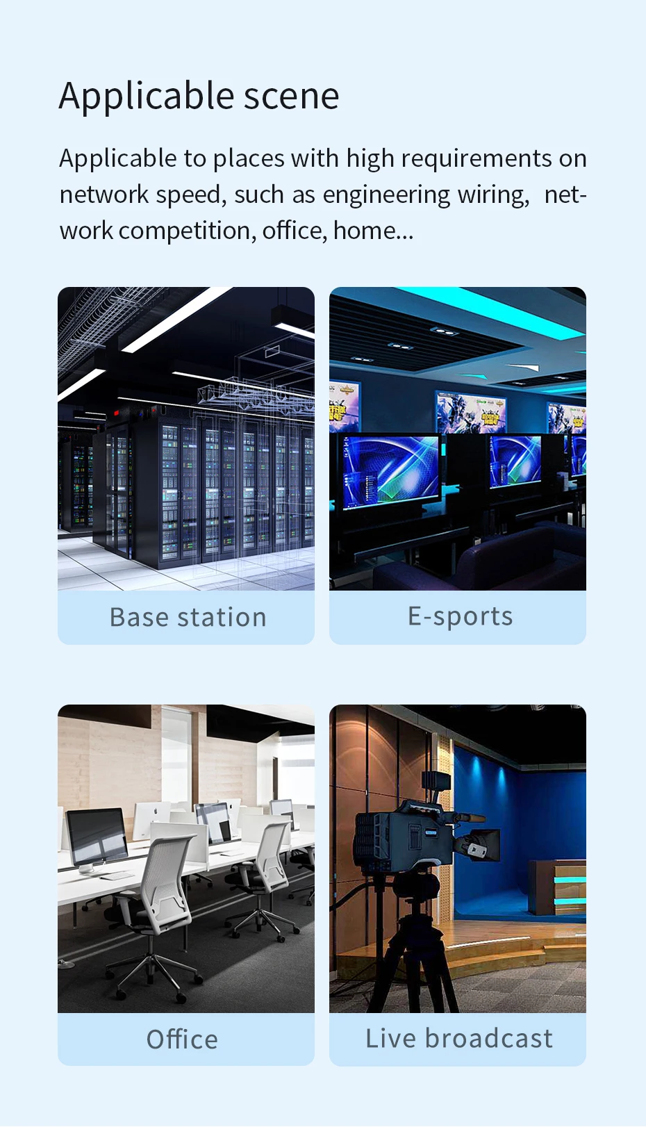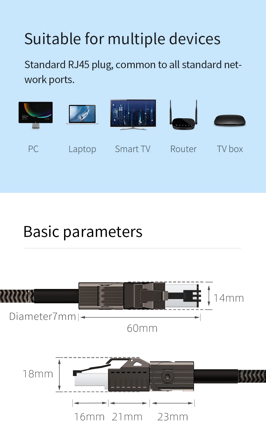 Con dos conectores RJ45 de aleación de zinc en ambos extremos, el cable Ethernet Cat8 funciona perfectamente con conmutador de red, cámara IP, routers, Nintendo switch, ADSL, adaptadores, módem, PS3, PS4, PS5, x-box, panel de conexiones, servidores, impresoras de redes, Netgear, tp-link, NAS, teléfonos VoIP, Portátil, acoplador, bujes, conector Keystone, Smart TV, Imac y otros dispositivos con conectores RJ45. También compatible con Cat7/Cat5/Cat5e/Cat6/Cat6e.