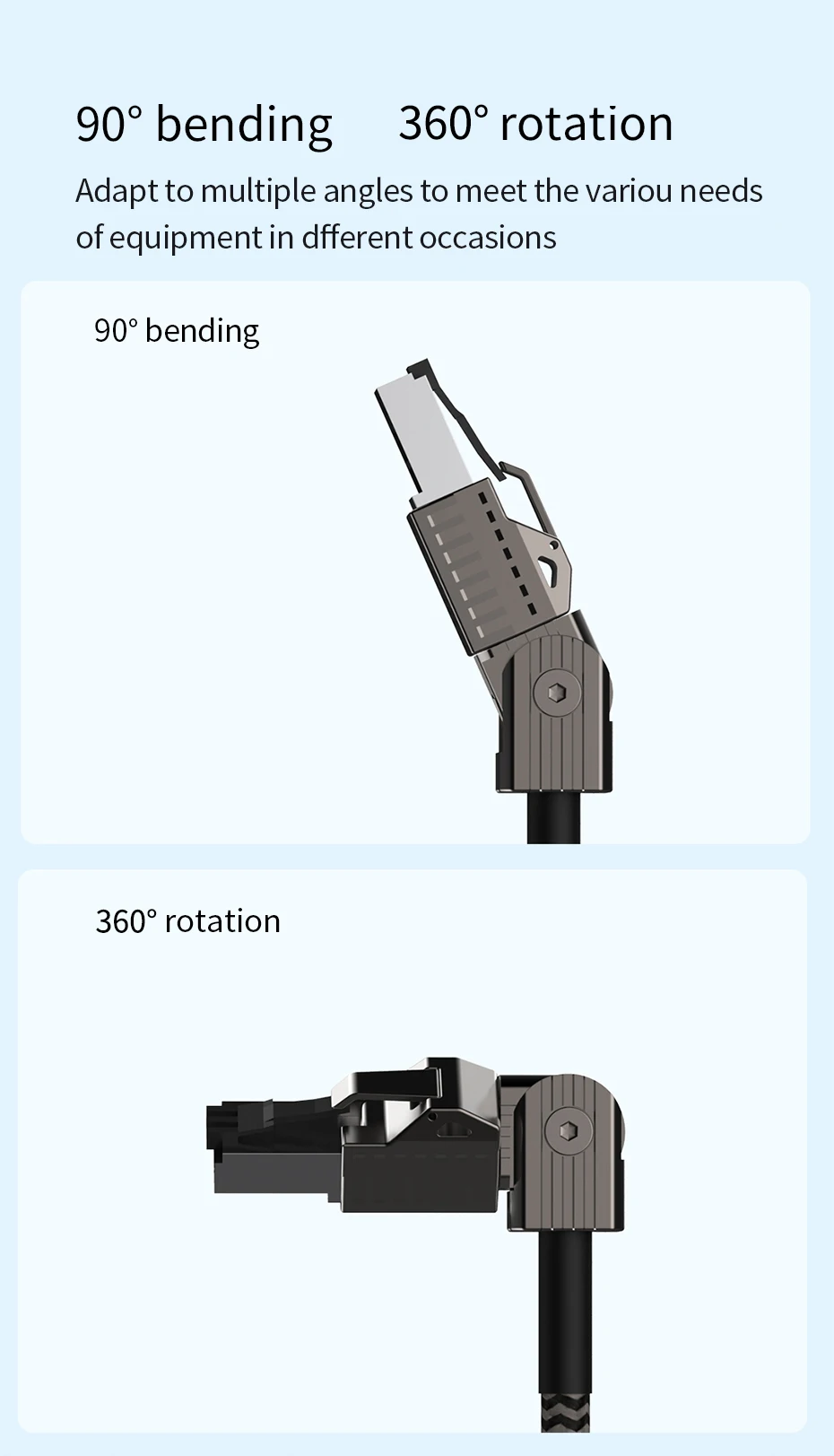 Este conector RJ45 se puede doblar y girar. Varios ángulos pueden satisfacer las necesidades del equipo en diferentes ocasiones y pueden hacer frente fácilmente al espacio estrecho.