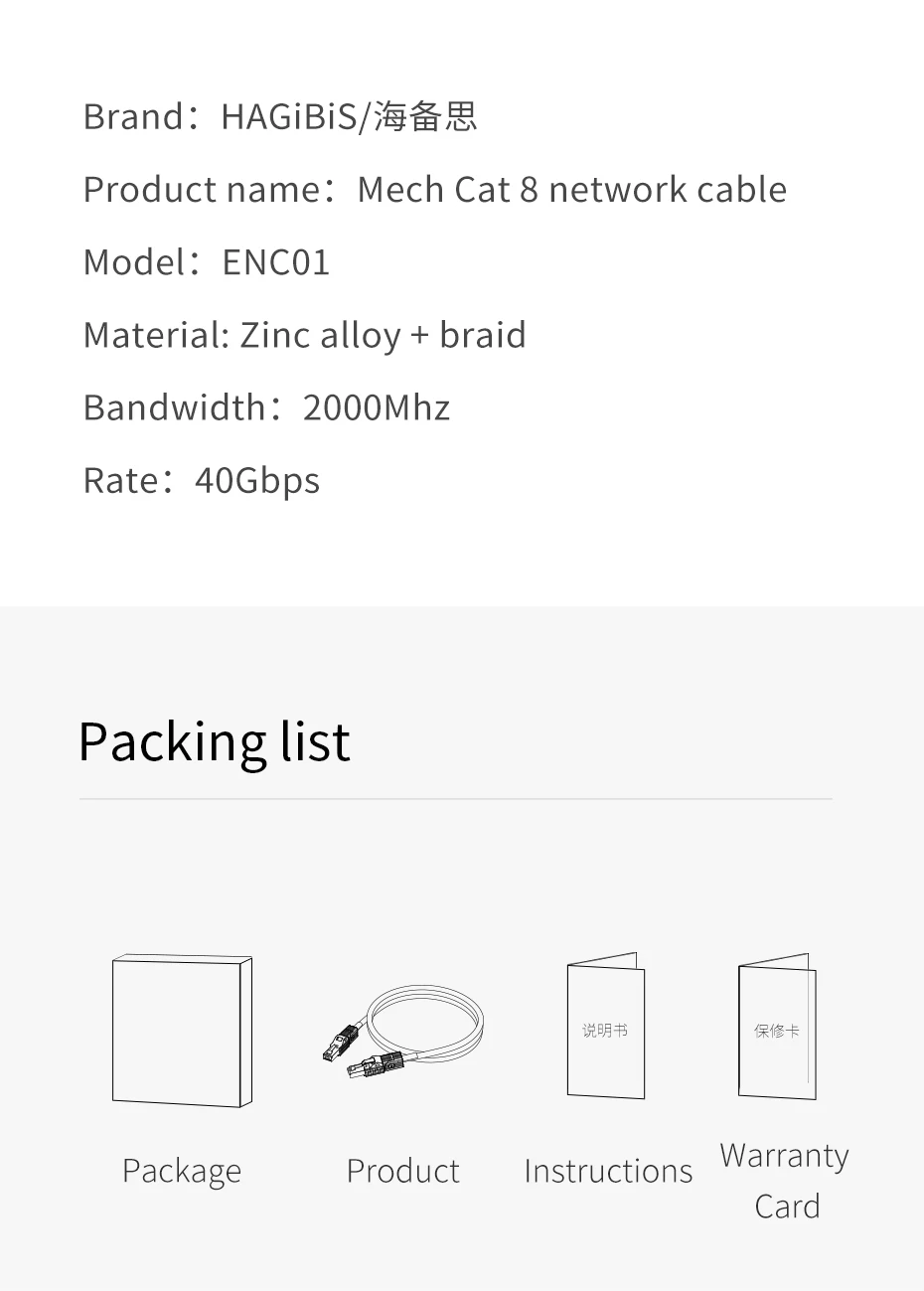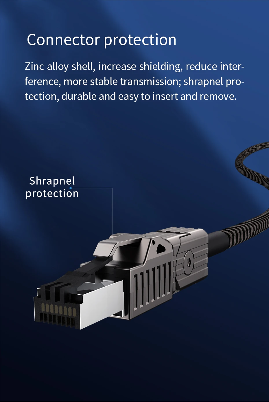 Con el cable 24AWG, el cable ethernet LAN hagilis cat8 está envuelto con 2 capas de chaquetas de alojamiento fiables y gruesas. La capa interior está hecha de una chaqueta de PVC resistente a los rayos UV de alta calidad, Y la capa exterior está hecha de una chaqueta trenzada de alta resistencia, que puede prevenir eficazmente el daño de la fuerza externa en el núcleo.