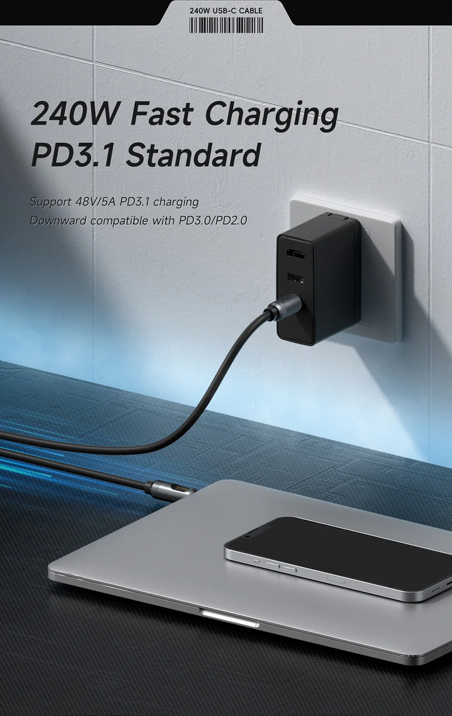 240W Fast Charging:This cable supports charging speeds of up to 240W (48V 5A). The USB C to USB C cable can charge any Type-C device, from smartphones to laptops. It is compatible with the PD3.1 fast charging protocol and supports backward compatibility with PD3.0/2.0. And also compatible with 140/100/60W power devices. Charge USB C devices from phones to laptops