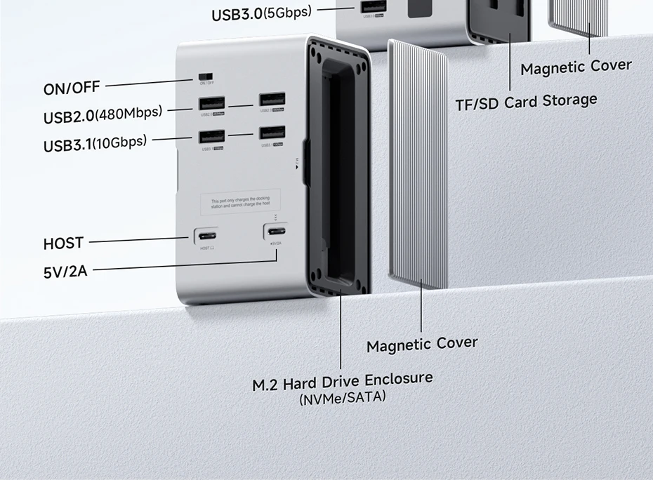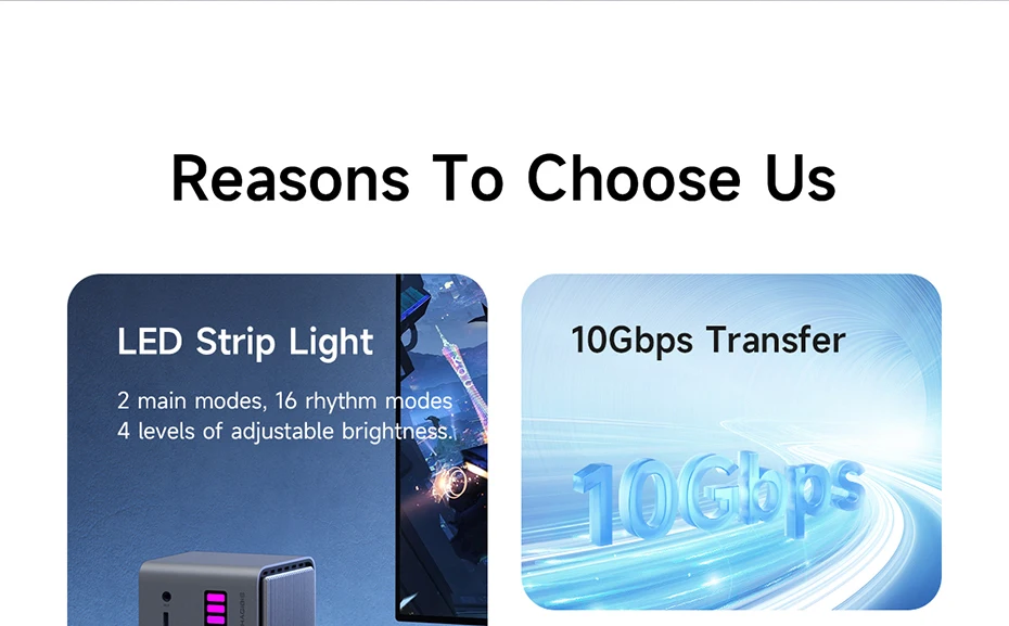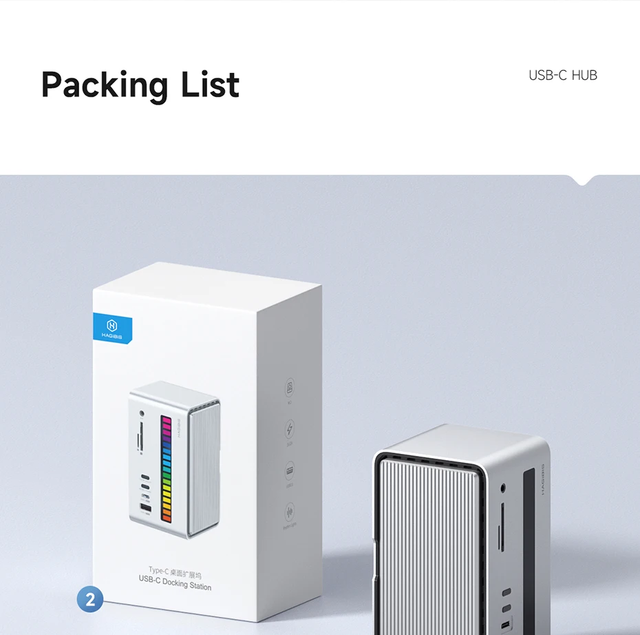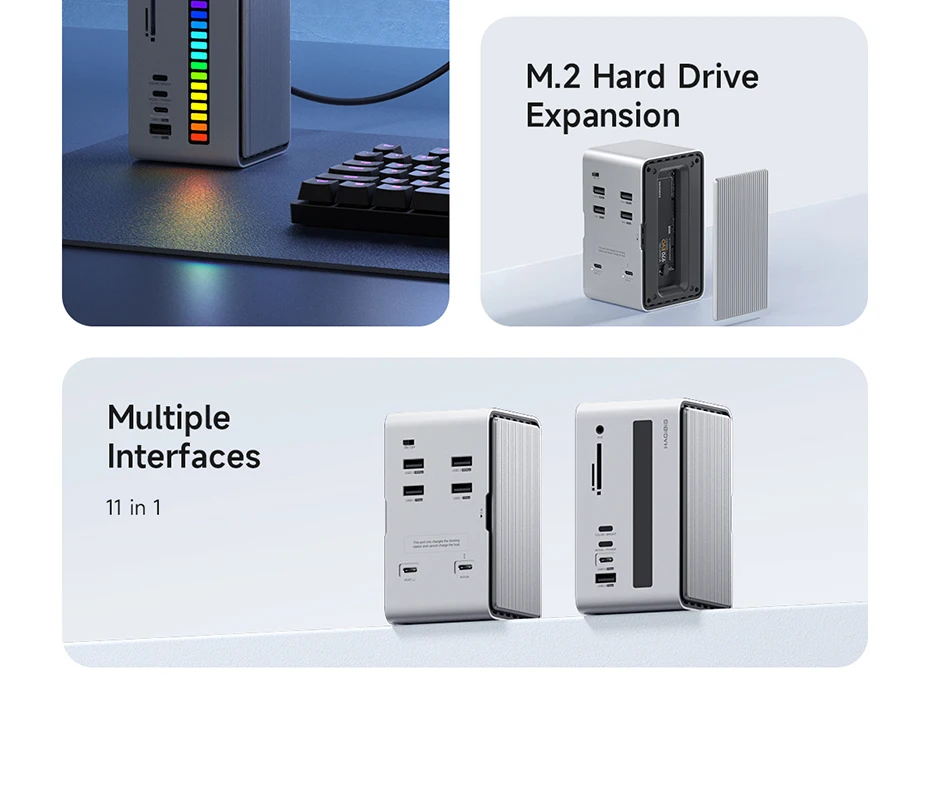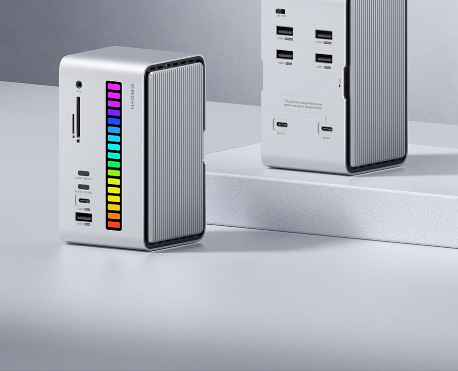 Estación de acoplamiento USB-C integrada única:Hagibis innovó y desarrolló este concentrador USB C de tira de luz LED RGB, que integra una estación de acoplamiento, una carcasa de disco duro, una tira de luz LED y una caja de almacenamiento de tarjeta SD, hace que su estación de acoplamiento sea diferente del resto y agrega color a su escritorio