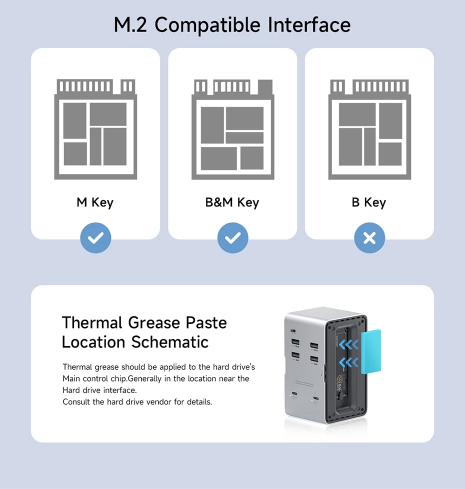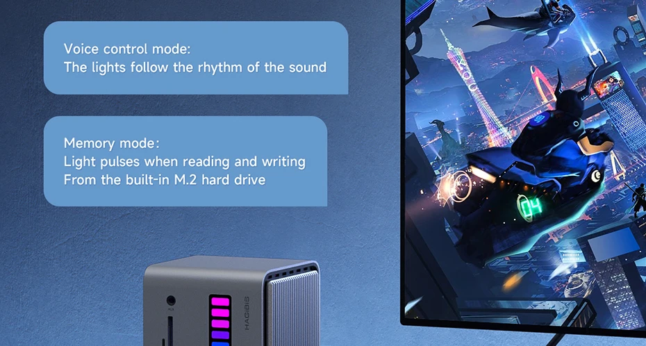 Caja de disco duro M.2:Compatible con discos duros M.2 NVMe y M.2 SATA. Si utiliza el modo de memoria RGB, la tira de luz LED golpeará cuando el disco duro escriba o lea.