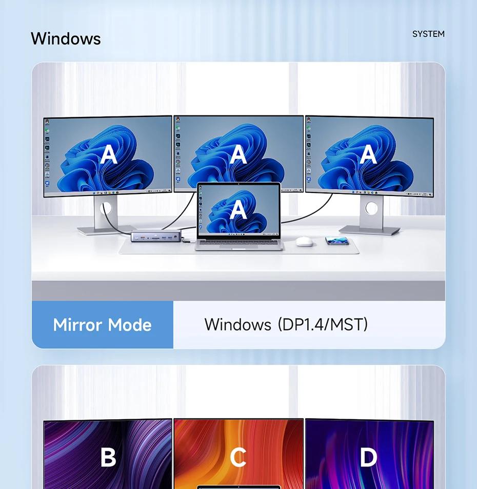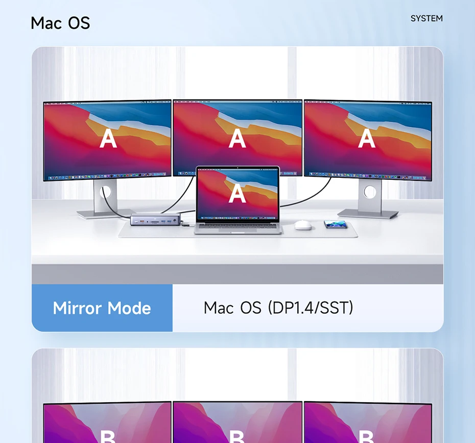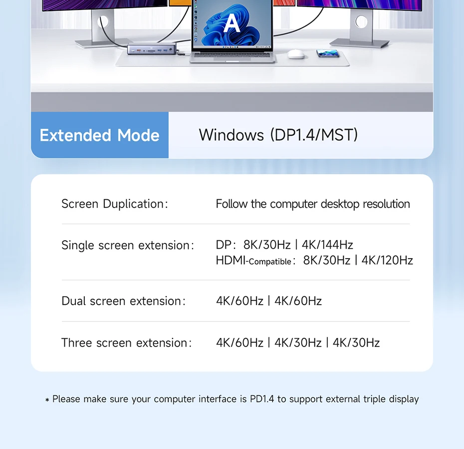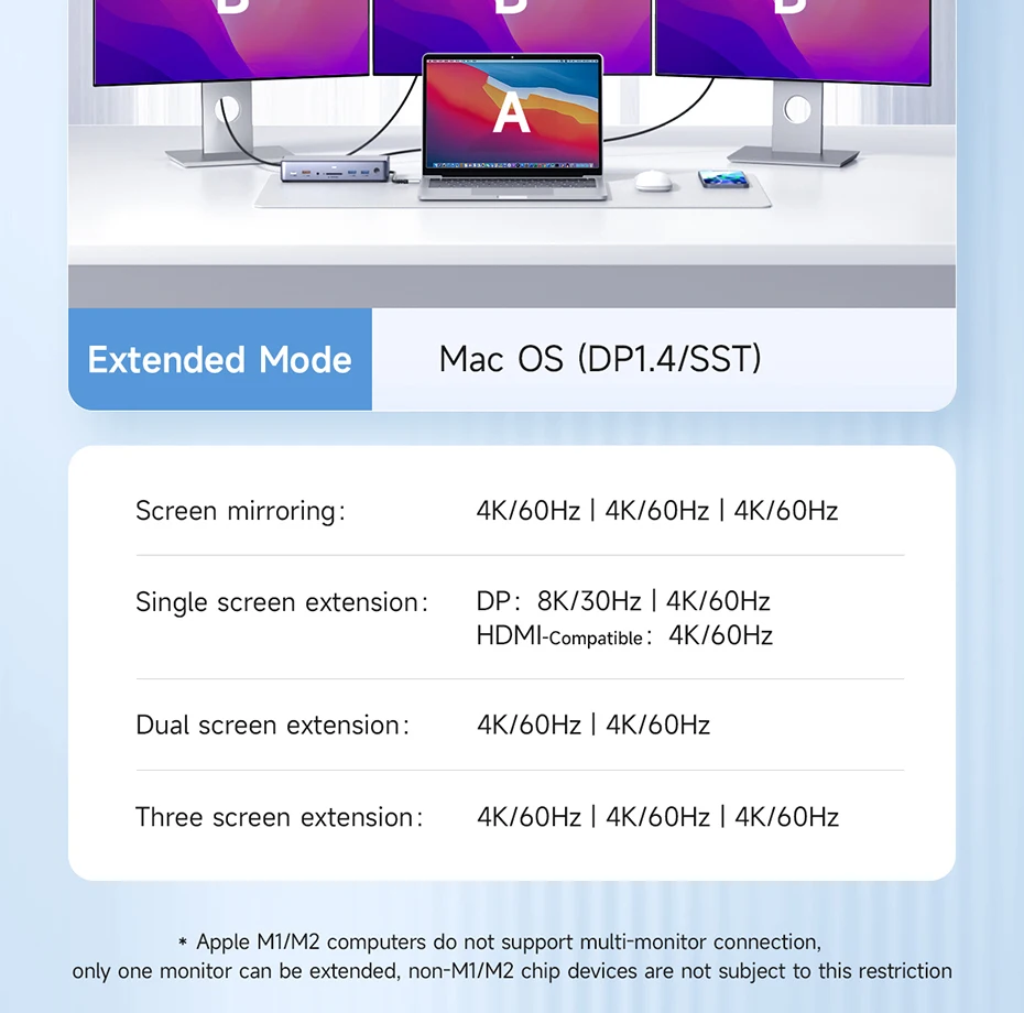 Estación de acoplamiento de pantalla triple:Hagibis-Estación de acoplamiento con tres puertos de salida de vídeo de alta resolución: 8K @ 30Hz HDMI + 8K @ 30Hz HDMI + 8K @ 30Hz DP, deje que su computadora portátil logre triple Monitor extendido o duplicado, puede disfrutar totalmente de 4 Pantallas múltiples desde 2 salidas HDMI, 1 salida DP y 1 pantalla de computadora portátil. * Los chips M1, M2 no admiten múltiples pantallas, solo se pueden expandir a una pantalla externa, pero los chips M1 Pro, M1 Max, M1 Ultra, M2 Pro, M2 Max no están limitados