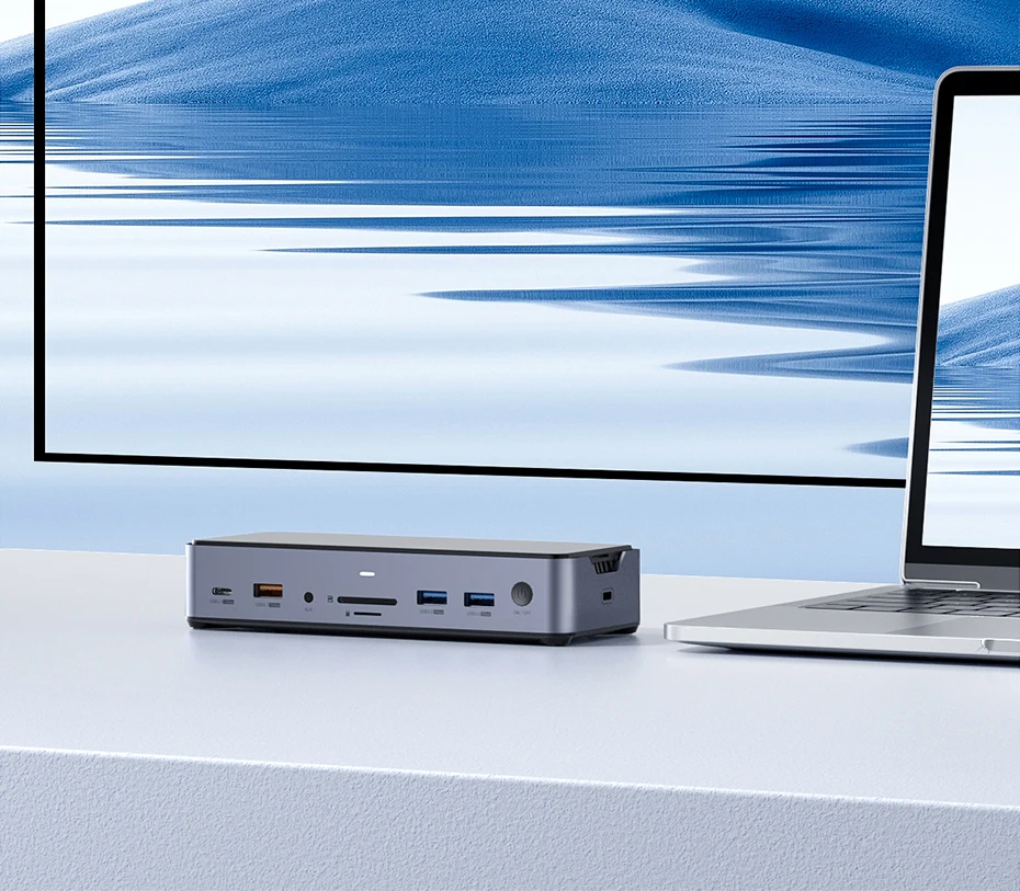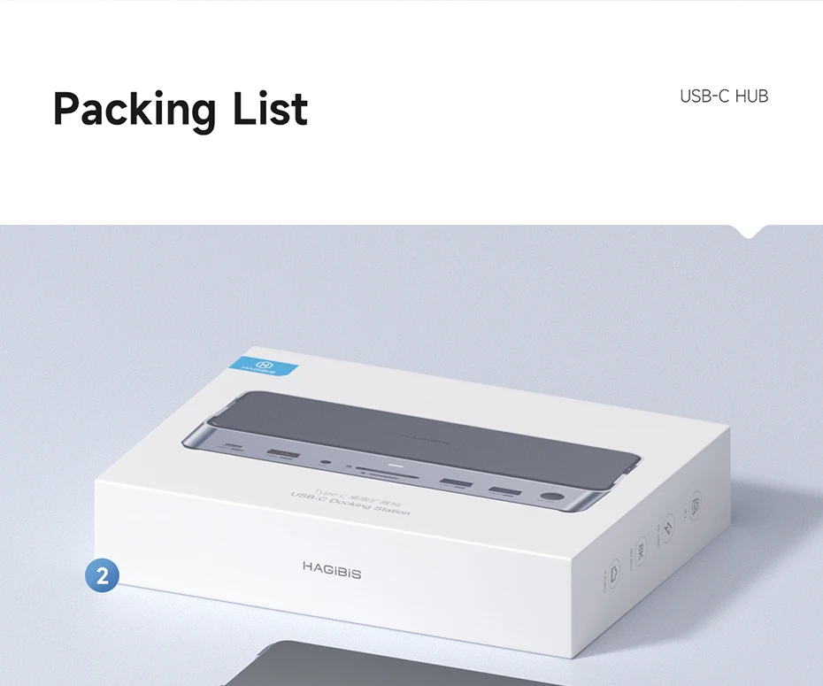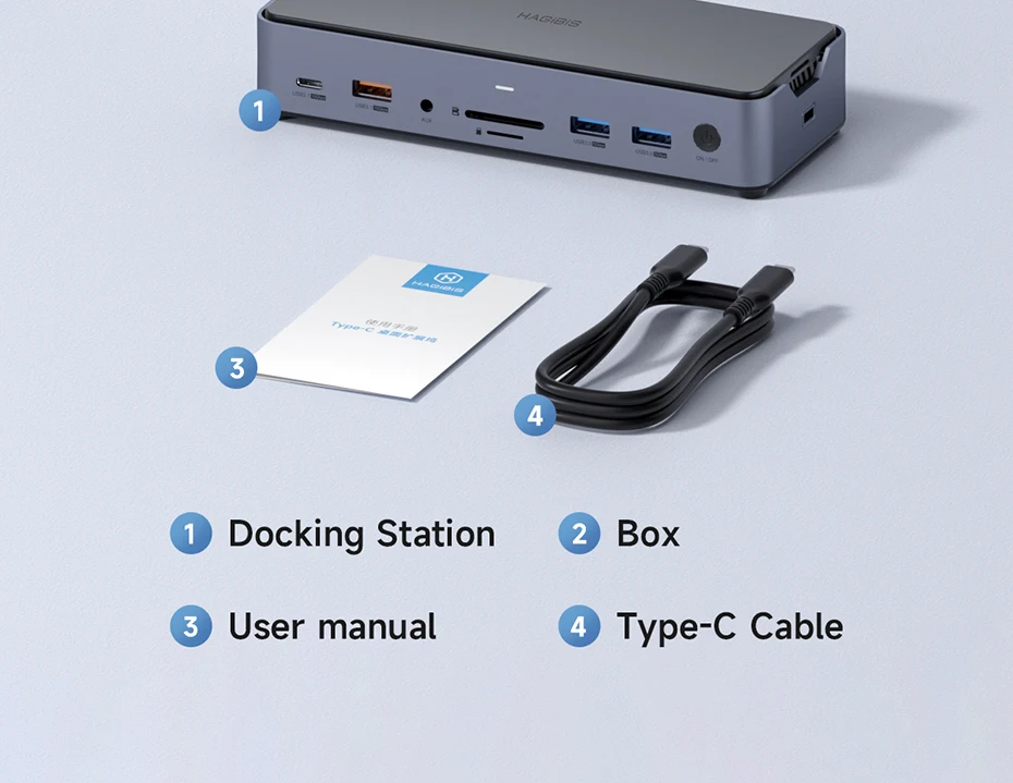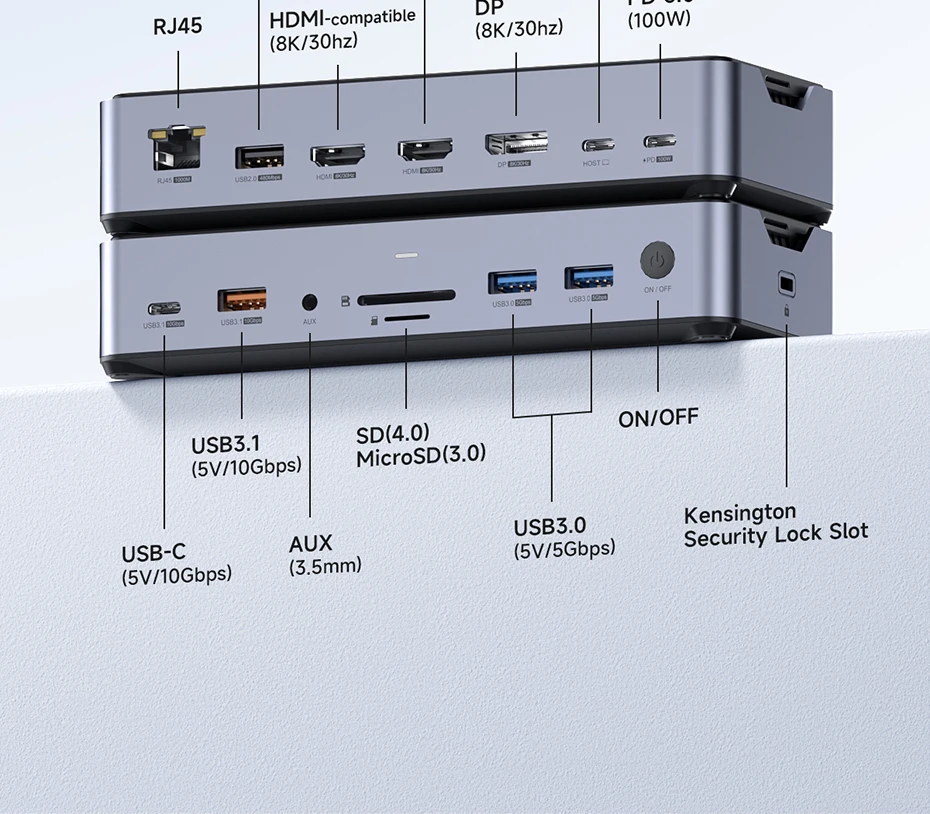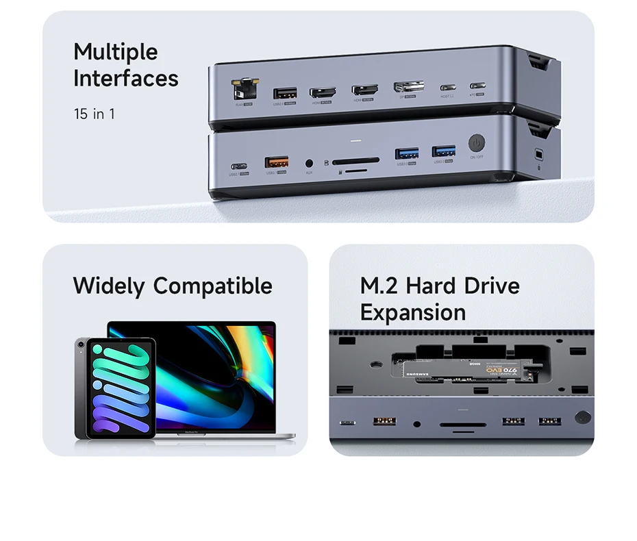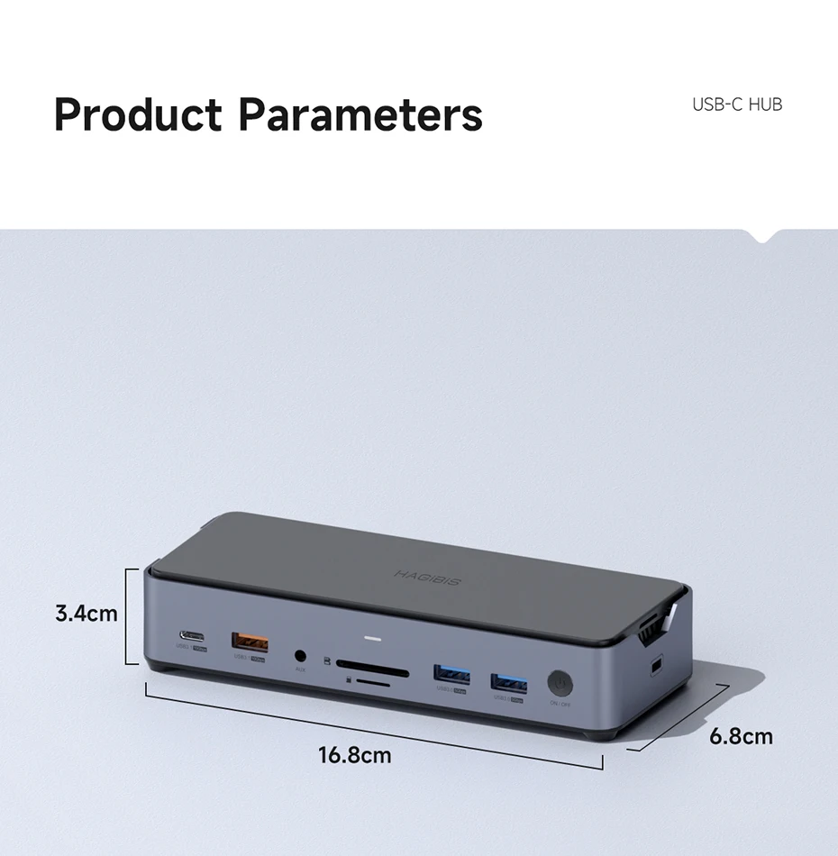 Estación de acoplamiento para portátil 15 en 1:La estación de acoplamiento de escritorio Hagibis 8K tiene una carcasa de disco duro SATA M.2 NVMe, puertos compatibles con HDMI 8K/30Hz * 1, Puerto DisplayPort 8K/30Hz * 1, puerto de entrega de energía de 100W * 1, Puerto Gigabit Ethernet de 1000Mbps * 1, ranura para lector de tarjetas SD4.0 * 1, ranura para lector de tarjetas Micro SD * 1, Puerto USB3.1 de 10Gbps * 1, puerto 3,5 de 10Gbps * 1, Puerto AUX de mm * 1, puertos USB3.0 de 5Gbps * 2, Puerto USB2.0 de 480Mbps * 1. Plug and Play, no requiere controlador, permite que su computadora portátil rompa el límite y juegue más funciones