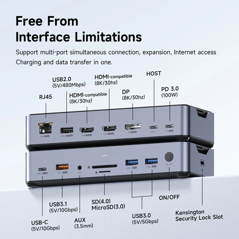 Estación de acoplamiento para portátil 15 en 1:La estación de acoplamiento de escritorio Hagibis 8K tiene una carcasa de disco duro SATA M.2 NVMe, puertos compatibles con HDMI 8K/30Hz * 1, Puerto DisplayPort 8K/30Hz * 1, puerto de entrega de energía de 100W * 1, Puerto Gigabit Ethernet de 1000Mbps * 1, ranura para lector de tarjetas SD4.0 * 1, ranura para lector de tarjetas Micro SD * 1, Puerto USB3.1 de 10Gbps * 1, puerto 3,5 de 10Gbps * 1, Puerto AUX de mm * 1, puertos USB3.0 de 5Gbps * 2, Puerto USB2.0 de 480Mbps * 1. Plug and Play, no requiere controlador, permite que su computadora portátil rompa el límite y juegue más funciones