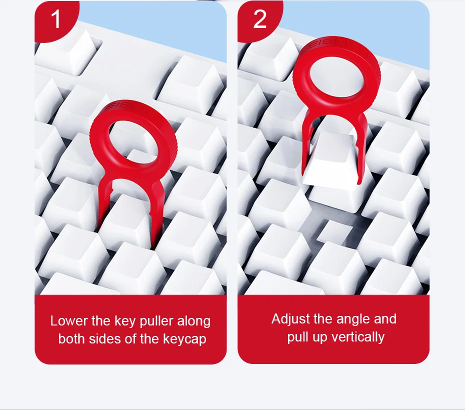 Quita fácilmente las teclas:Solo dos pasos, fácil de tirar de la tapa de la llave. Paso 1: baje el extractor de teclas Hagibis a lo largo de ambos lados de la tecla. Paso 2: ajuste el ángulo y tire hacia arriba verticalmente