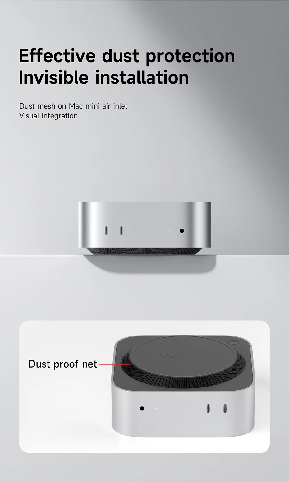 Es excelente para mantener todo el polvo fuera de la computadora, ya que es bastante difícil desmontar esta generación de Mac mini. Hay 4 unidades de filtros de polvo con 2 tamaños de malla diferentes: grande y fino. Incluso después de instalar el más pequeño, no tengo ninguna queja sobre el flujo de aire.