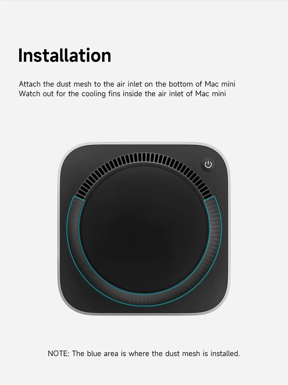 muy bueno para proteger tu mac mini del polvo las instrucciones no son muy claras pero también son fáciles de adivinar Creo que protegerá el ventilador interno de mi mac del polvo.