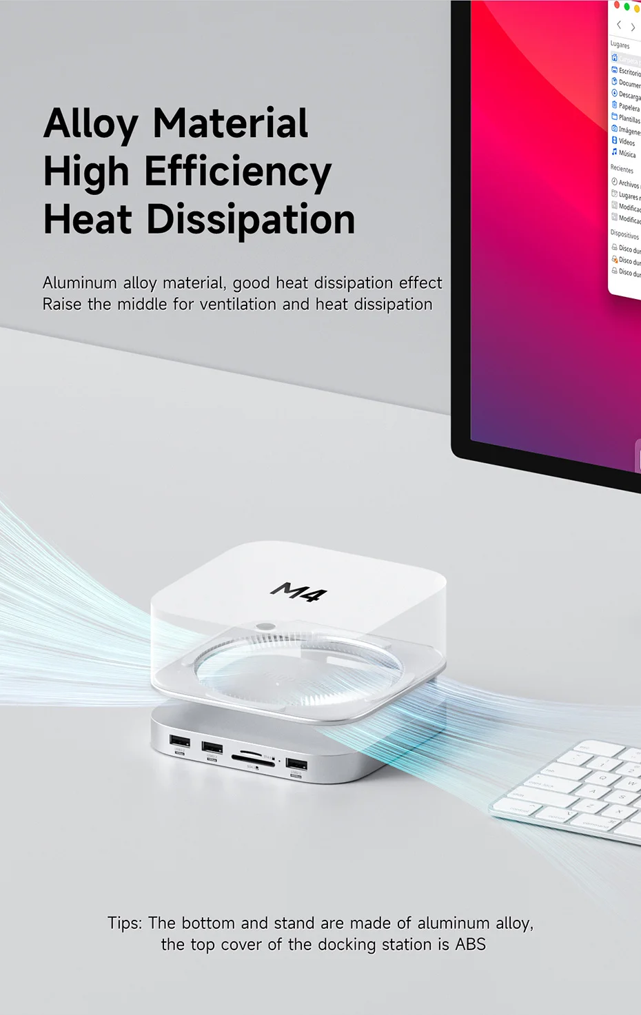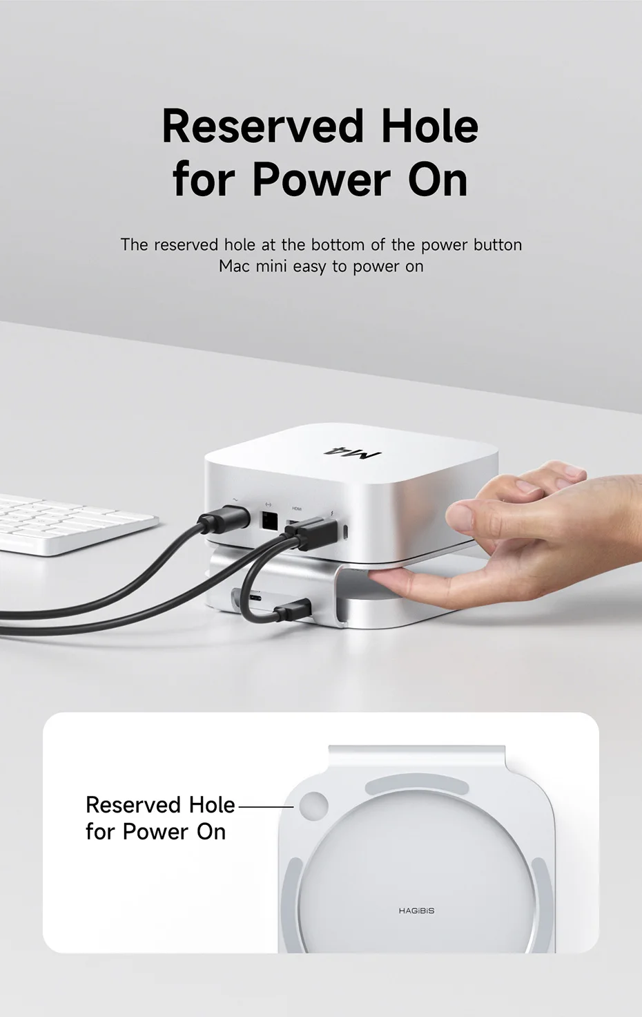 Disipación de calor de alta eficiencia:Este soporte tiene un material de aleación de aluminio que tiene un buen efecto de disipación de calor.Y aumente el diseño del medio para lograr una mejor ventilación y disipación del calor.*Nota: Hemos reservado un orificio de encendido para Mac Mini M4/M4 Pro en el soporte para que los usuarios puedan encender fácilmente el Mac Mini M4/M4 Pro en la parte inferior.