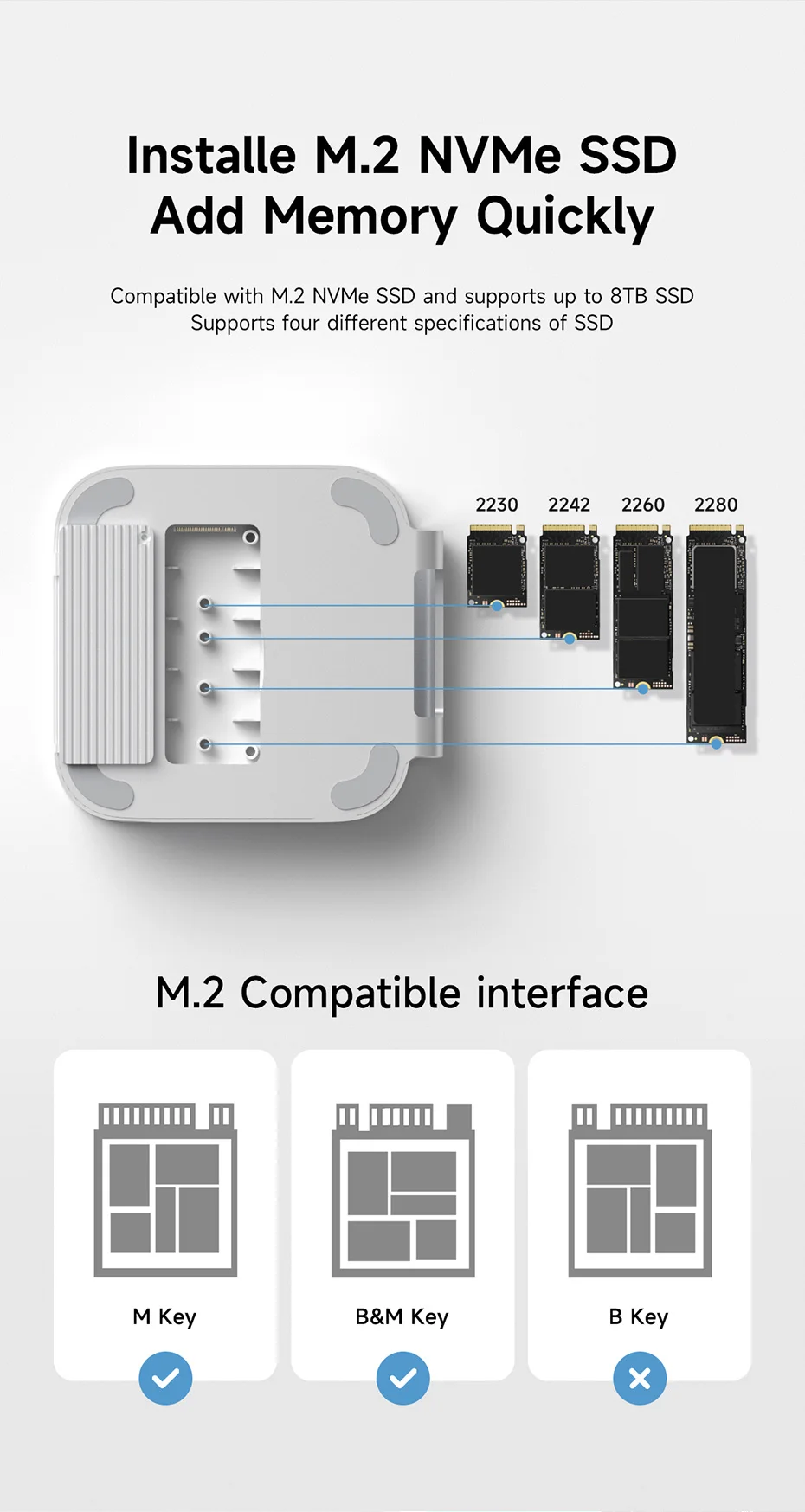 Agregar memoria de almacenamiento:Esta carcasa SSD es compatible con SSD NVMe M.2 2230/2242/2260/2280 y admite SSD de hasta 8 TB con velocidades de hasta 10 Gbps.*Nota: SSD no está incluido