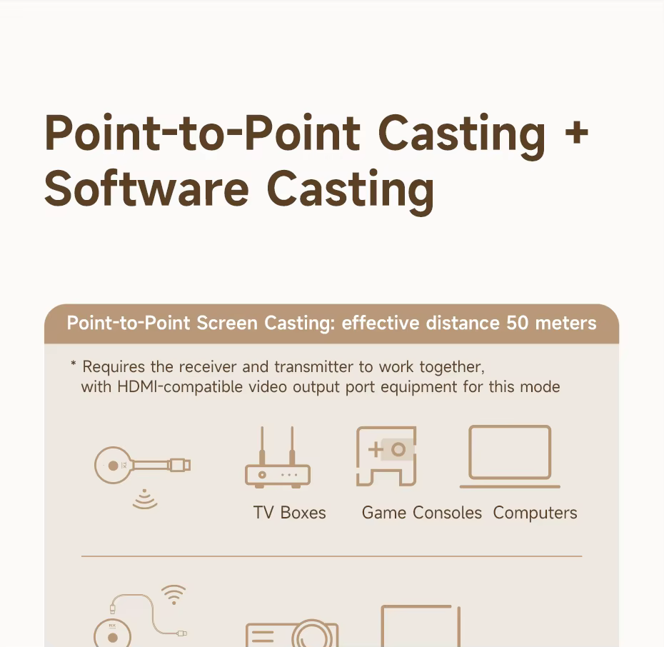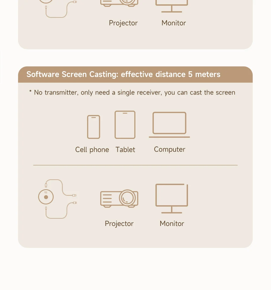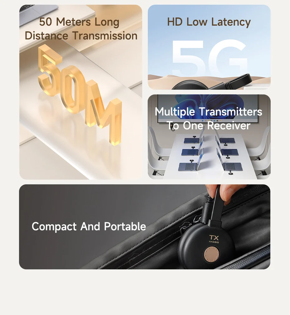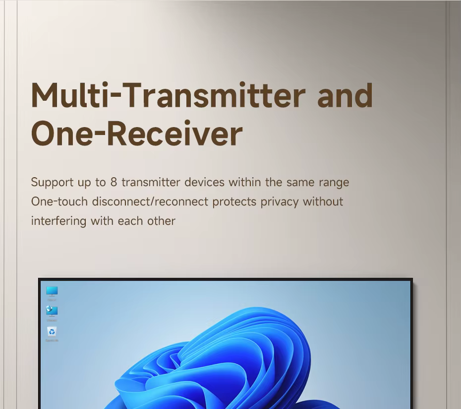 Admite hasta 8 transmisores:Un receptor admite hasta 8 conexiones de transmisor, lo que le permite cambiar entre imágenes de pantalla grande haciendo clic en los botones de los transmisores para mejorar la eficiencia de su reunión