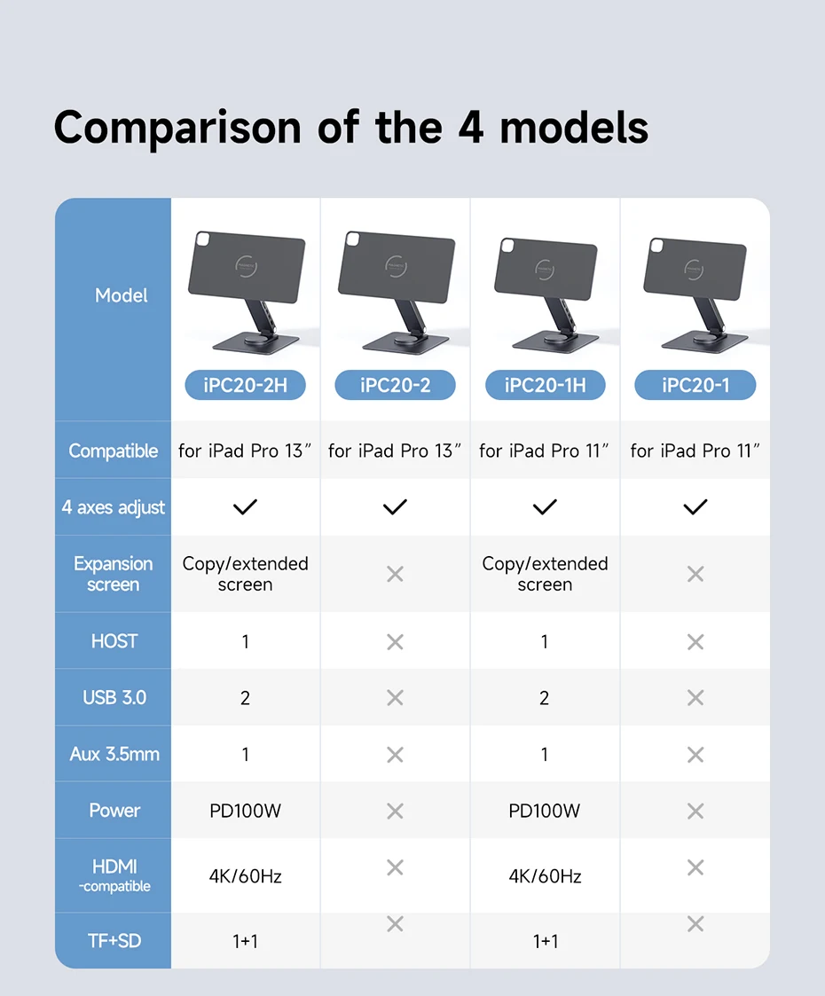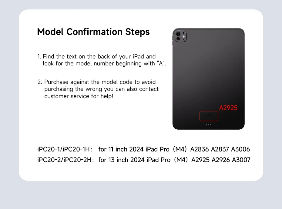 Compatibilidad:Este soporte solo admite 2024 modelos del nuevo iPad Pro M4 11 ''-13'' (A2836/A2925) , confirme su elección antes de la compra, para evitar errores de compra, ¡También puede ponerse en contacto con nuestro servicio en línea para ayudarle!