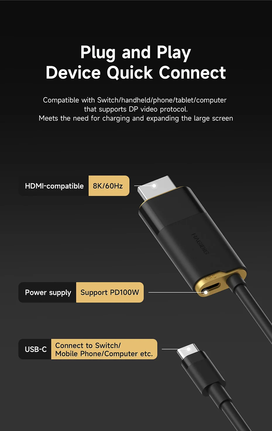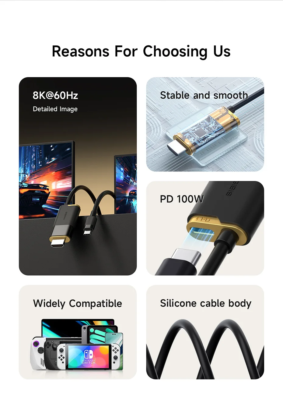 Por el precio, está excelente. No estoy seguro de que alguna vez necesite 8k 6Hz, pero estar preparado para el futuro es un buen detalle. El cable no es tan flexible como las variantes hechas de silicona líquida, y el conector USB-C es un poco difícil de conectar y desconectar de mi portátil (puede ser una ventaja dependiendo de tu caso de uso); se sujeta con firmeza. El paso de carga PD funciona perfectamente. Pequeño y práctico dock para ver películas y jugar en la pantalla grande del televisor.