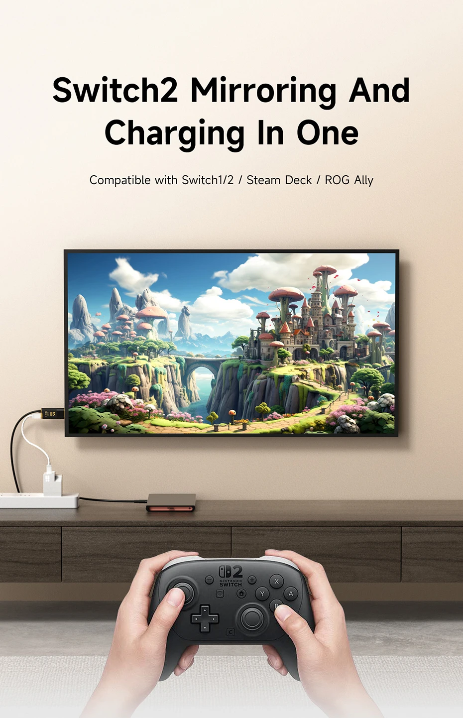 Ampliamente compatible:El adaptador compatible con USB C a HDMI no solo es compatible con Nintendo Switch, Switch Oled, Switch2, sino que también es compatible con computadora portátil, tableta, teléfono móvil, Steam Deck, ROG Ally, TV/proyector y otros Thunderbolt4/3 USB C 3.1 DP Alt dispositivo de modo.Nota: Esta base de interruptor no es compatible con Switch Lite