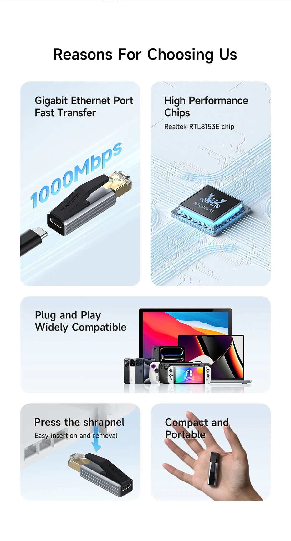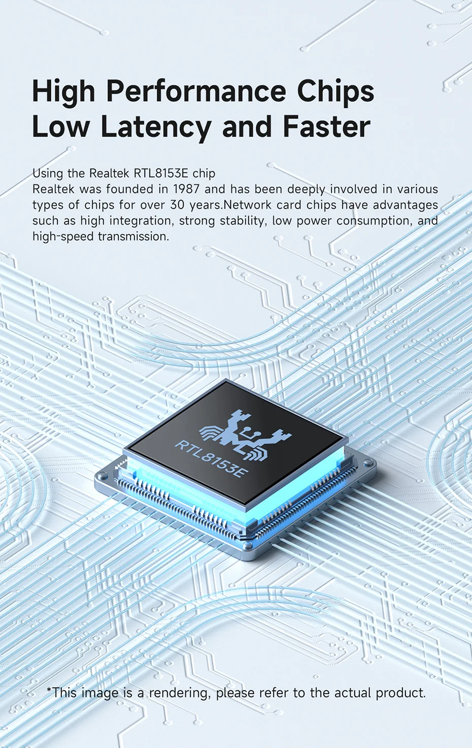 Chips de alto rendimiento Baja latencia y más rápido:Utilizando el chip Realtek RTL8153E, los chips de tarjetas de red tienen ventajas como alta integración, gran estabilidad, bajo consumo de energía y transmisión de alta velocidad.