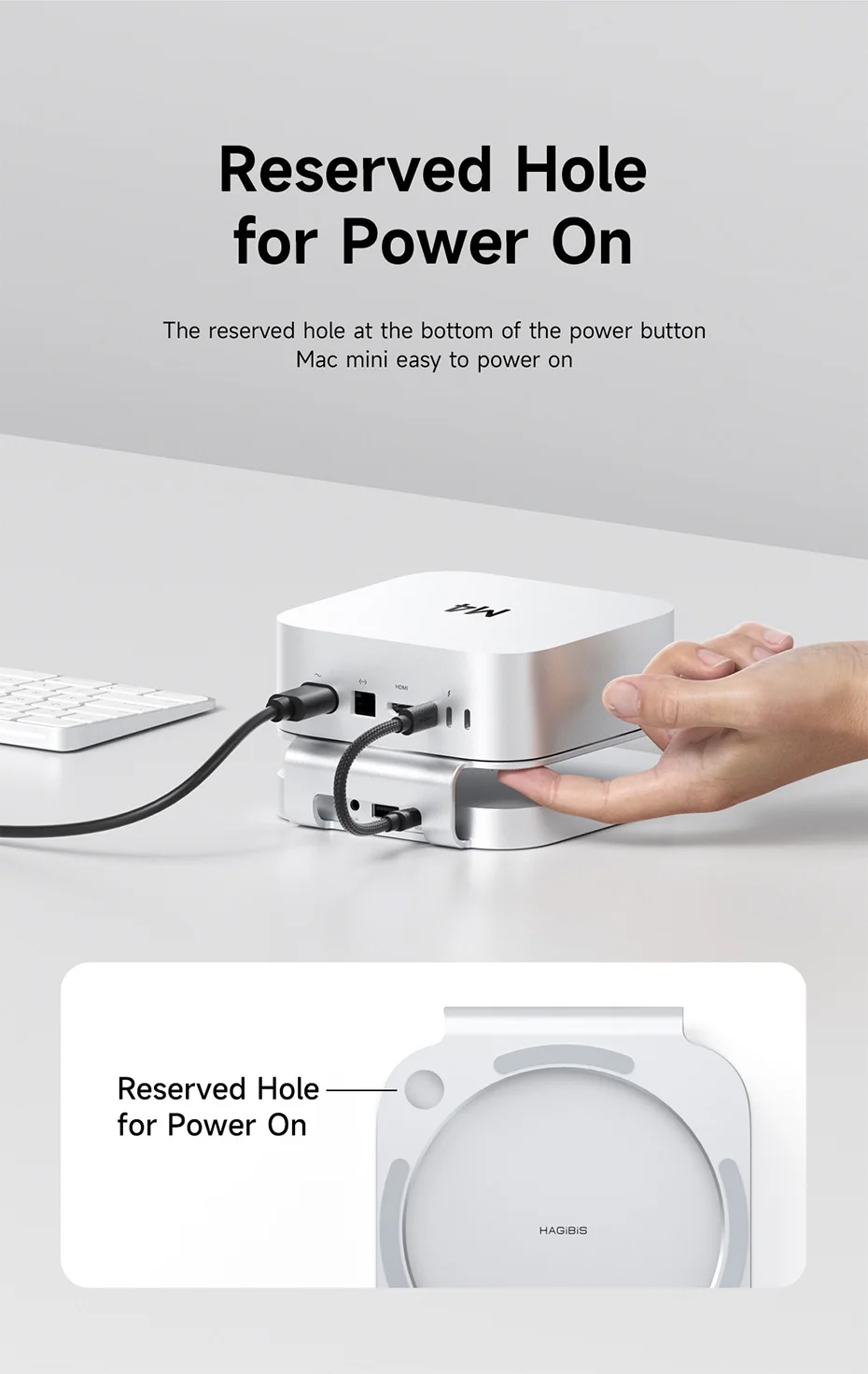 Disipación de calor de alta eficiencia:Este soporte tiene un material de aleación de aluminio que tiene un buen efecto de disipación de calor.Y aumente el diseño del medio para lograr una mejor ventilación y disipación del calor.*Nota: Hemos reservado un orificio de encendido para Mac Mini M4/M4 Pro en el soporte para que los usuarios puedan encender fácilmente el Mac Mini M4/M4 Pro en la parte inferior.
