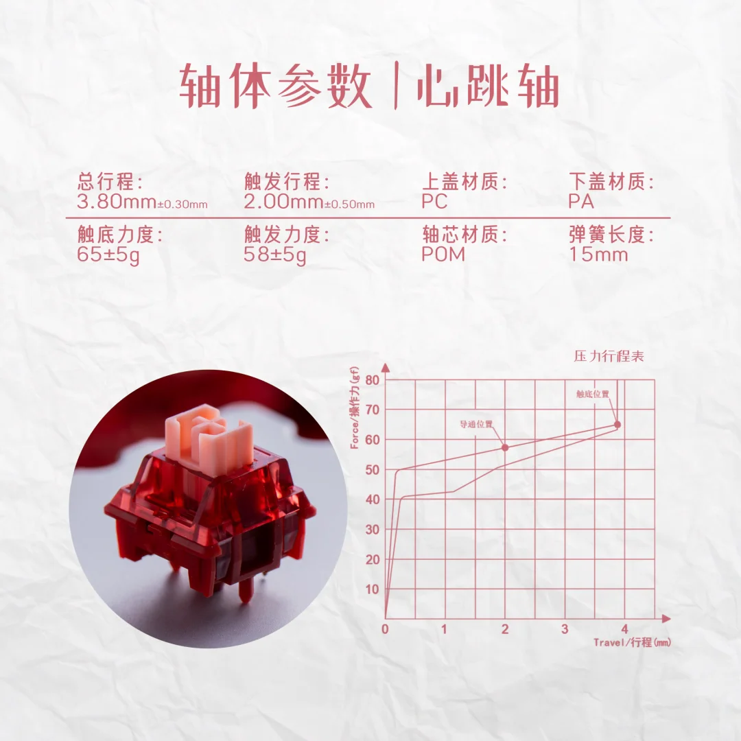 * Fuerza inicial: 58±5gf * Fuerza de salida: 65 ± 10 gf * Recorrido total: 3,8 ± 0,3 mm * Resorte: Resorte personalizado de 15 mm * Pre-ublado: Sí * Estilo de escritura: lineal silencioso