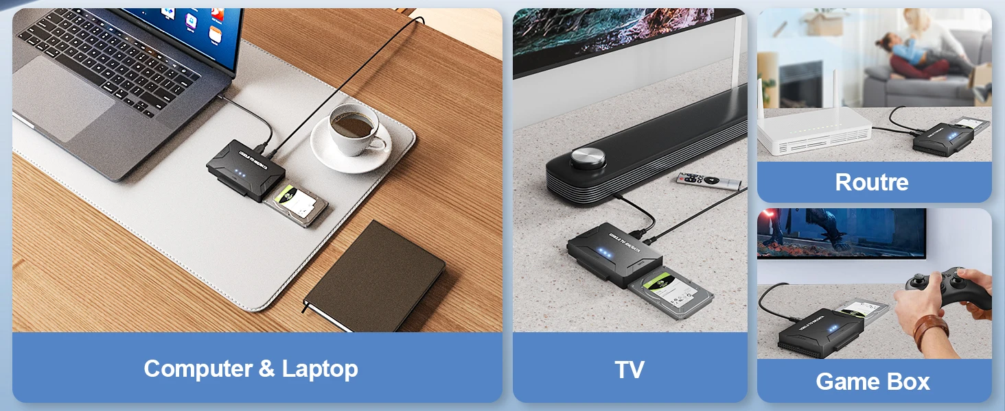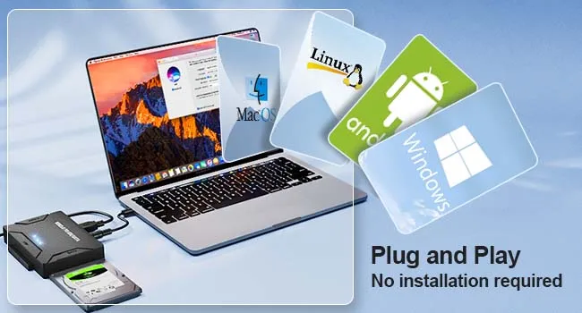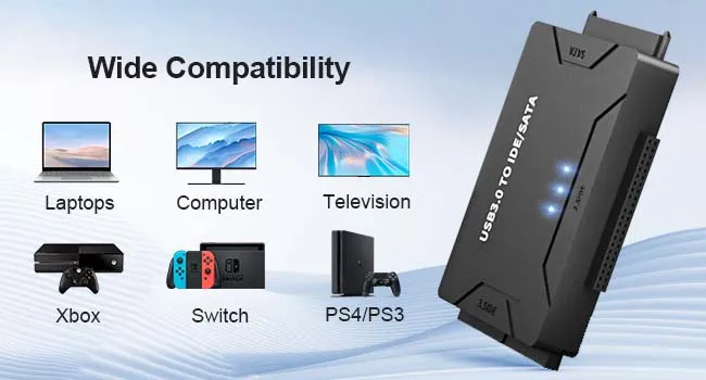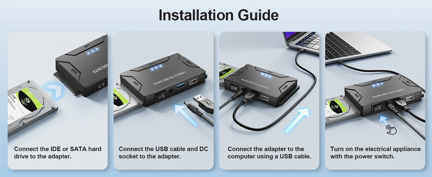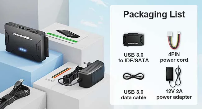 2.Este adaptador SATA/IDE a USB admite velocidades de transferencia de hasta 5 Gbps. La velocidad de transmisión real está limitada por la configuración del dispositivo conectado; Compatible hacia abajo con USB 1.1/2.0