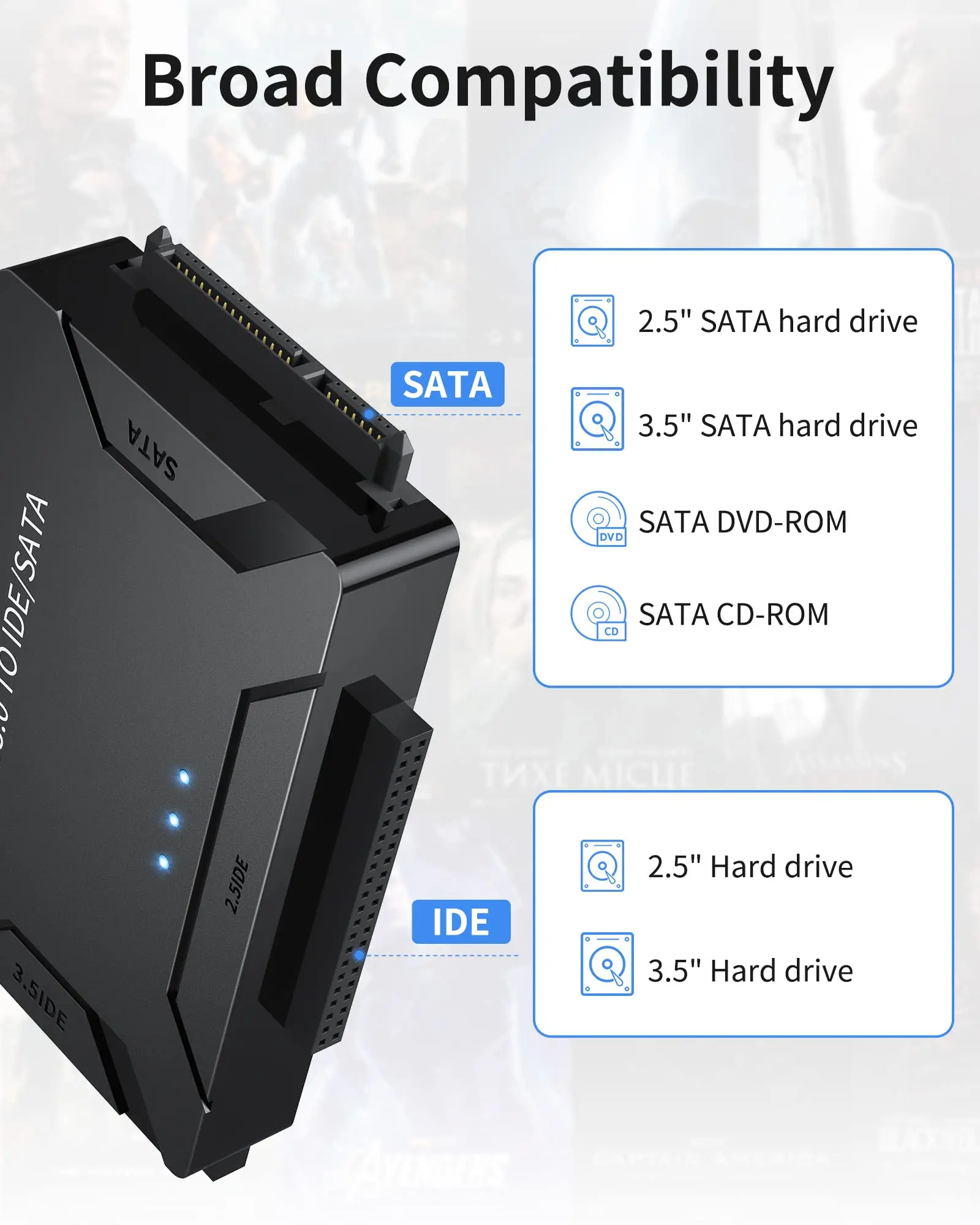 1.Admite todos los SDD SATA/IDE HDD de 2,5/3,5 pulgadas y CD/DVD ROM de 5,25 pulgadas, COMBO, DVD-RW.Adaptador de DVD-RAM