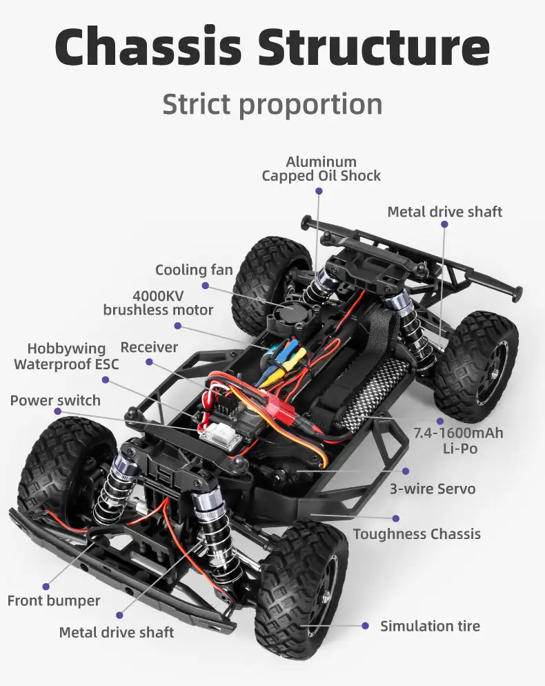 Electrónica avanzada: ESC sin escobillas independiente y sistema de radio de 2,4 GHz con un alcance de más de 150 metros.