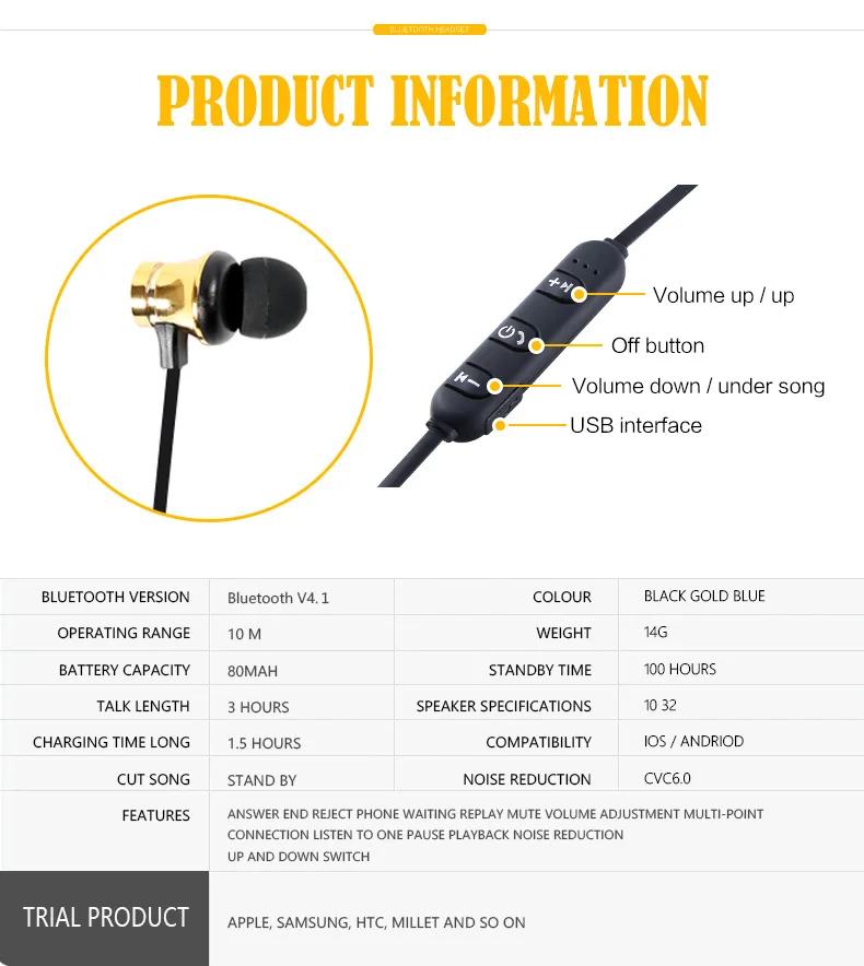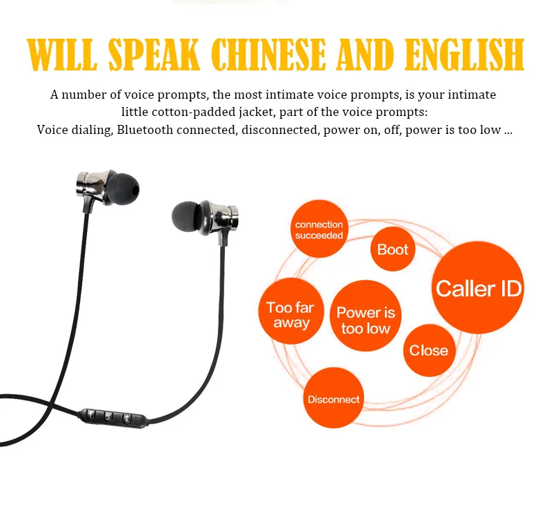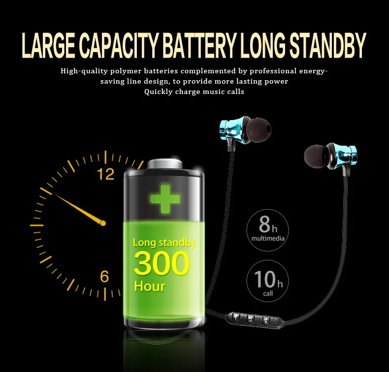 Auriculares inalámbricos Bluetooth magnéticos (CHIP Bluetooth V4.2). Características del producto Versión de Bluetooth: Versión 4,2 Distancia de transmisión: distancia en línea recta al aire libre 10 metros Capacidad de la batería: Batería de polímero de litio 55mAh Tiempo para escuchar música: 2,5 horas. Admite subir/bajar canciones. Tiempo de conversación: 2,5 horas Tiempo en espera: 130 horas Tiempo de carga: 1-2 horas Corriente de trabajo: 22MA Corriente de espera: 4ua Método de emparejamiento: pulsación larga de luces rojas y azules en modo de emparejamiento. Cambio de voz en chino e inglés: cuando las luces roja y azul parpadean alternativamente, presione el botón de encendido dos veces. Tono de aviso: Mensaje de arranque: ENCENDIDO Aviso de Apagado: apagado Indicador DE ESTADO coincidente: emparejar Aviso de conexión: su dispositivo está conectado Aviso de desconexión: su dispositivo se está desconectando Consejos de baja potencia: Batería baja Función clave: pulsación larga de inicio, pulsación larga para apagar, haga clic en pausa de música/reproducción/respuesta de llamada/colgar el teléfono, haga doble clic en la siguiente canción.