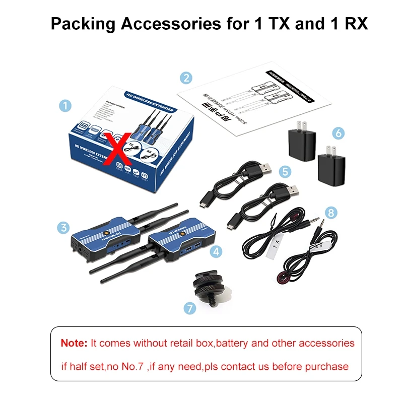Transmisor x1 Receptor x1 Adaptador de corriente x2 Cable de alimentación USB x2 Cable IR x2 Adaptador de zapata de 1/4 de tornillo x1 Manual de usuario x1 Bolsa de transporte x1 (es un regalo solo para cada TX y un RX en un solo pedido)