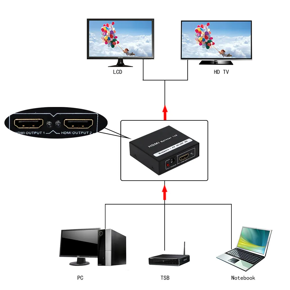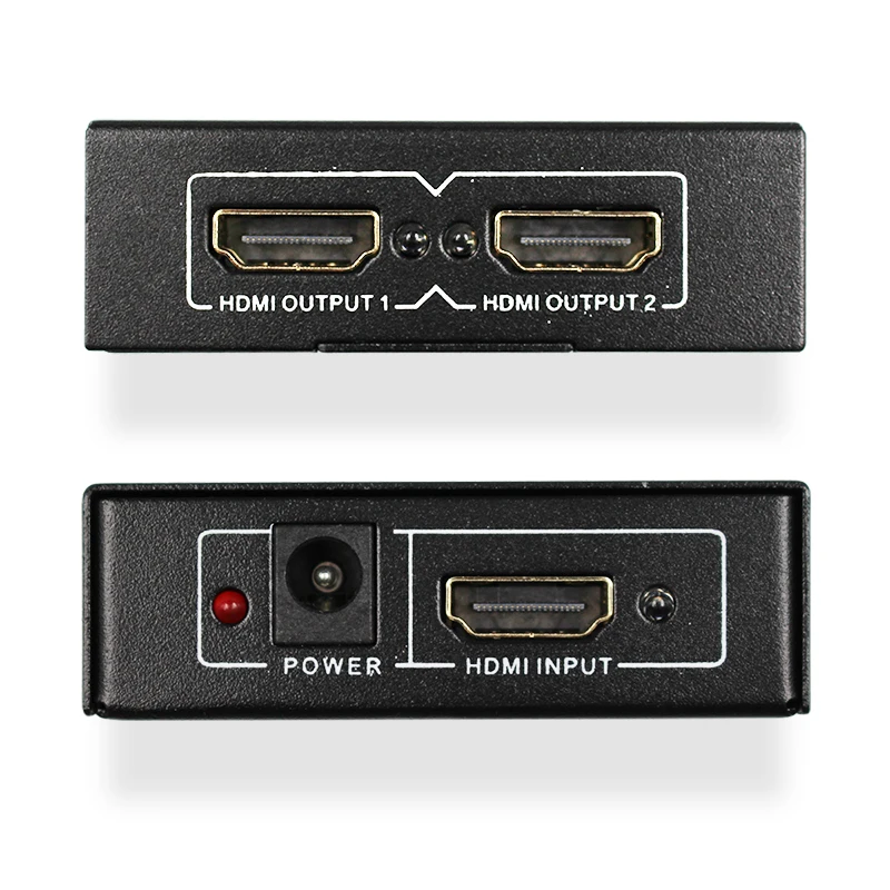 1. 1x2 divisor HDMI se distribuye: 1-fuente HDMI a 2-pantallas HDMI simultáneamente