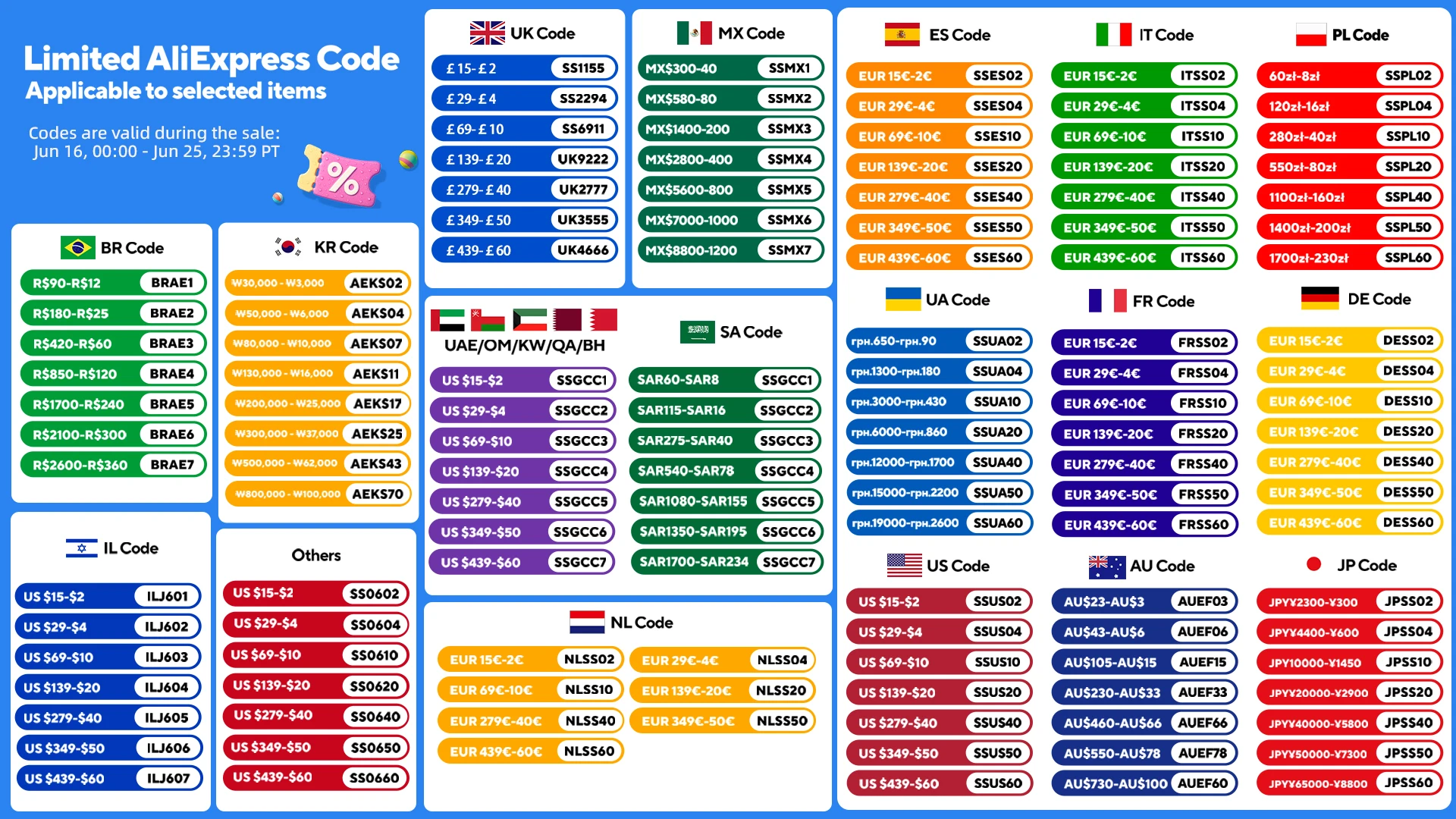 Los códigos son válidos durante la venta:Jun 16, 00:00 -jun 25,23:59 PT