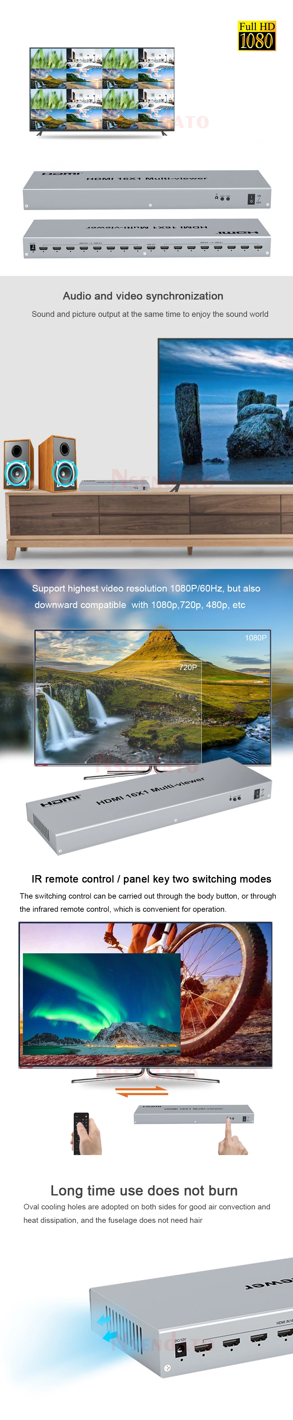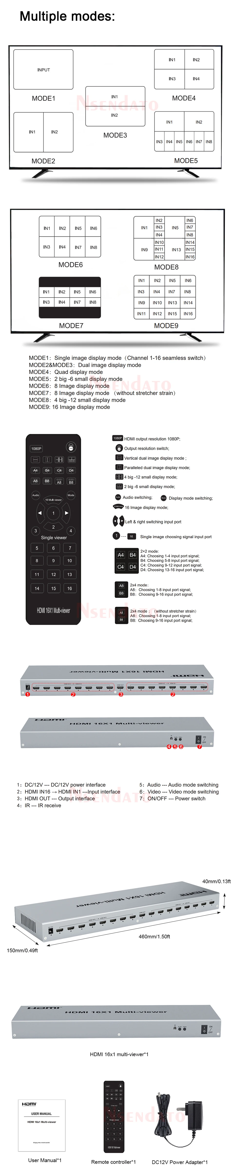 Nsendato HDMI 16x1 Multi-visor es un alto rendimiento con segmentación de Pantalla 16 HD y salida de conmutación perfecta. Puede mostrar 16 señales de vídeo digitales HD en la misma pantalla y tiene una variedad de segmentación de vídeo, conmutación sin interrupciones de 16 señales de entrada HD sincronizada. Los métodos de control del interruptor son flexibles, se pueden cambiar a través del botón y el control IR. Es un interruptor muy práctico y estable y fácil de instalar, se puede utilizar en los principales proyectos, salas de reuniones y otros lugares.