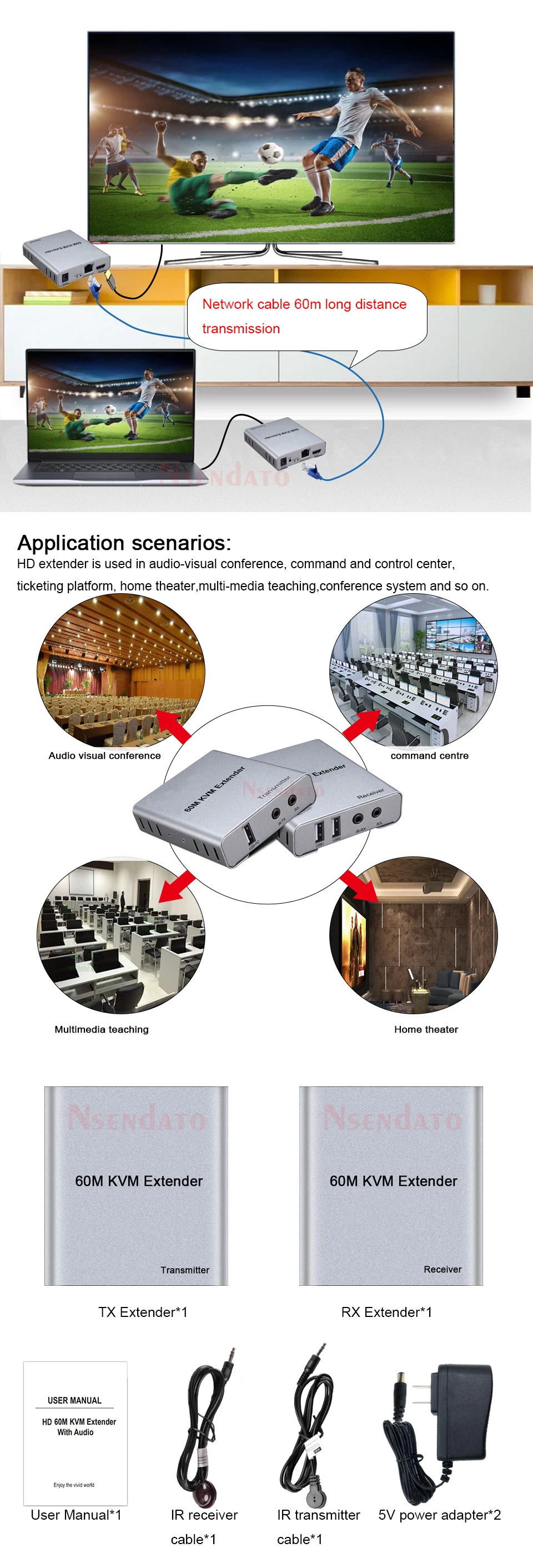 HD USB KVM extensor 60m por cat5/6 Cable 1080p 60Hz HD transmisor receptor KVM interruptor con Audio IR Control ratón y teclado puerto