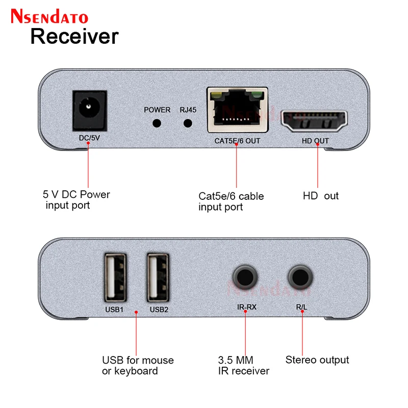 El extensor Nsendato utiliza cables cat5e individuales o cat6 (recomendados) en lugar de cable HD para transmitir señal de alta definición hasta 60 metros, reduciendo el costo. El extensor está diseñado para suministrar transmisión a larga distancia de señal de alta definición.